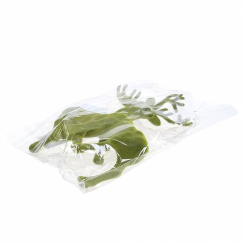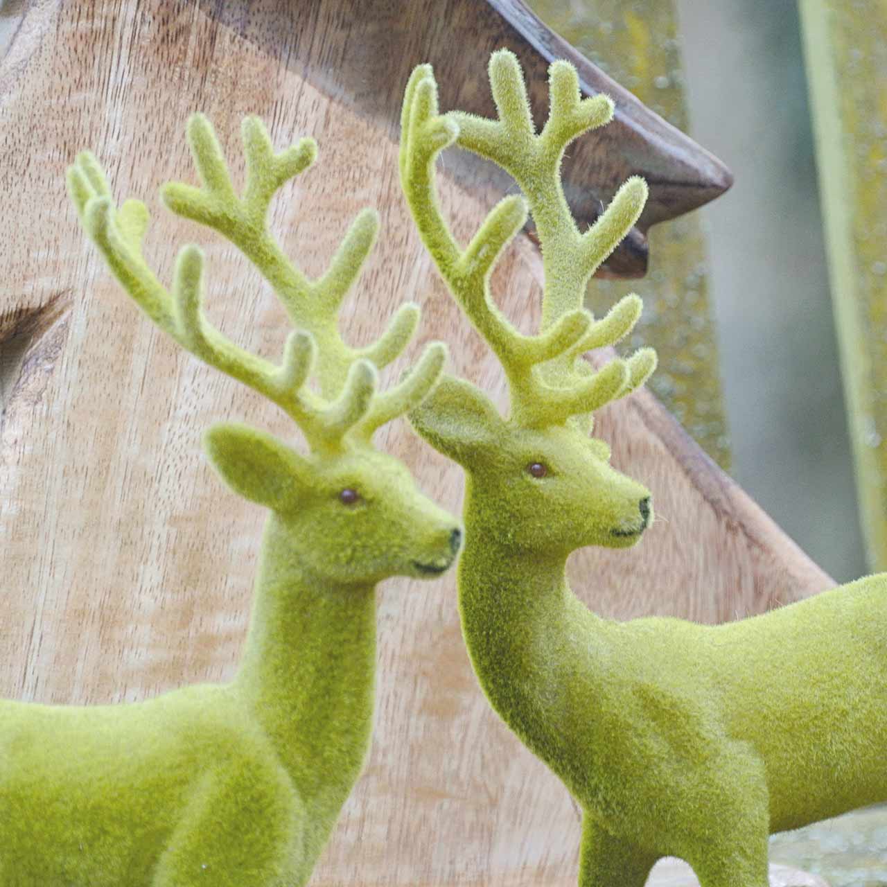 Två små dekorativa renar står i en glans. Hennes flockade päls, grön som den känsliga snötäckta mossan som hennes hovar står på, skimrar sammet.På detta sätt eller liknande skulle du kunna implementera en vinterdekoration hemma med den högkvalitativa flockade dekorativa renarna i grönt. För att göra detta, placera ett långt ark mossgrönt dekorativt tyg som en löpare över matbordet. Sprid lite konstgjord snö över ytan och placera de två dekorativa renarna. På vissa punkter kan du lägga till några kottar och bitar med snö täckt med mossa. - Din snöiga rensning med renpar är redo!