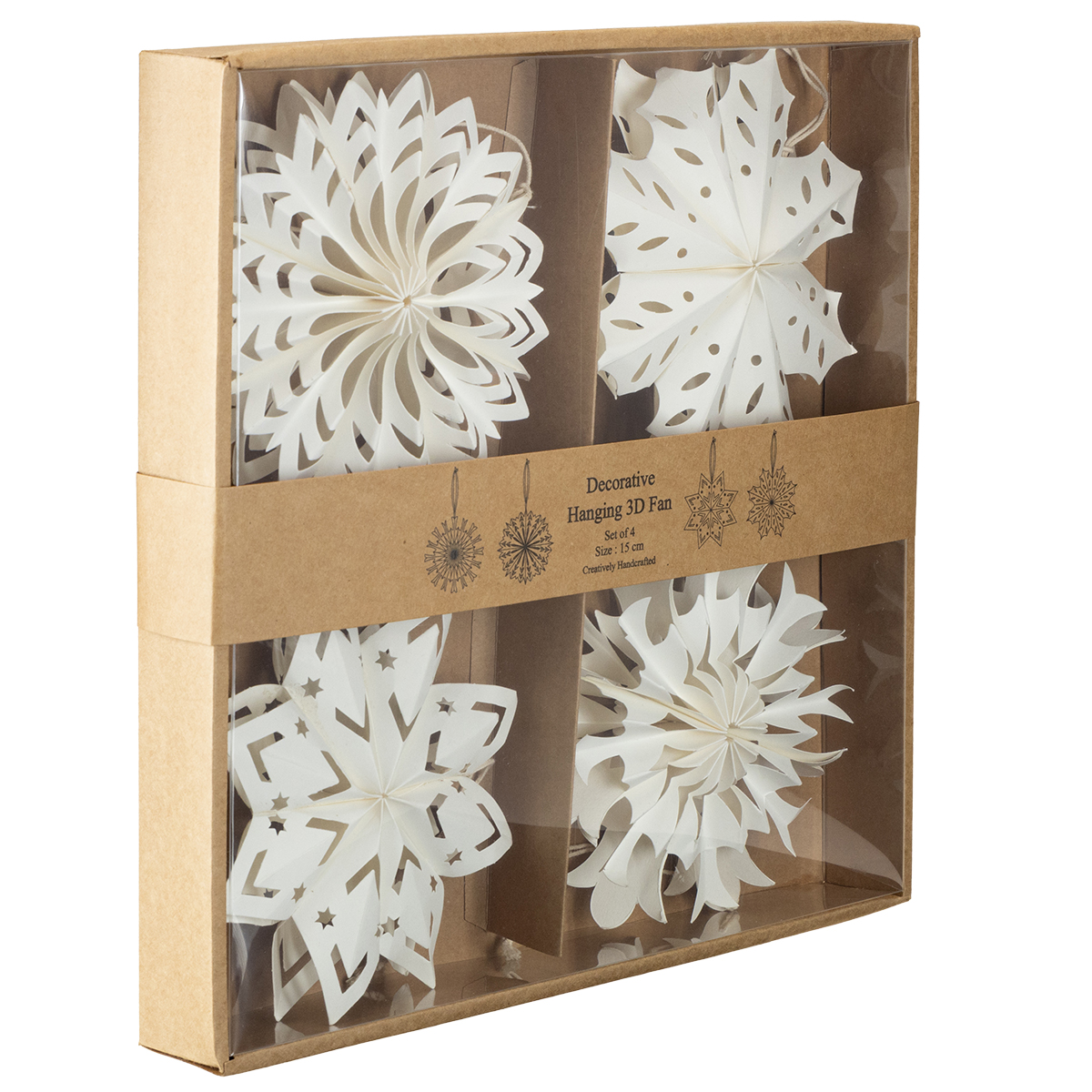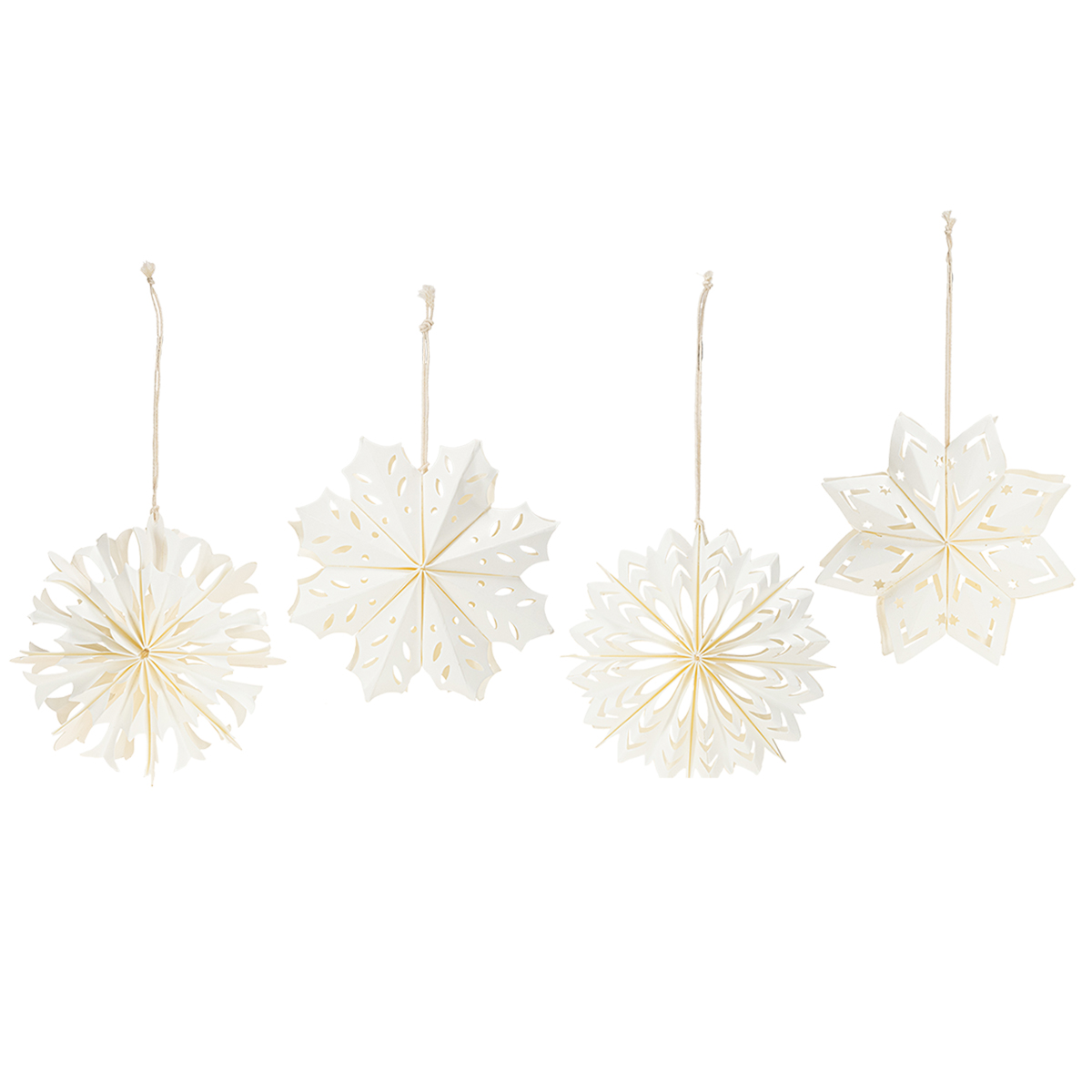 Våra dekorativa snöflingor i papper kombinerar stil, enkelhet och praktiska egenskaper. Setet innehåller fyra olika snöflingor, var och en med ett öppet mönster som påminner om det unika utseendet hos riktiga snöflingor. De är tillverkade av högkvalitativt, tjockt papper och erbjuder stabilitet och ett elegant utseende. Att hänga upp dem är enkelt med det medföljande bomullssnöret, och tack vare sin neutrala vita färg kompletterar snöflingorna nästan alla inredningsstilar.
