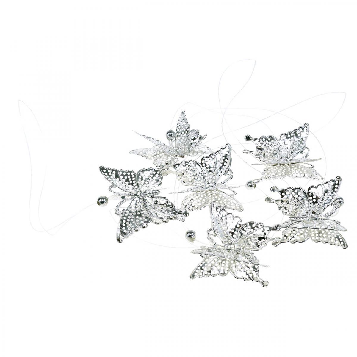 De dekorativa fjärilarna är filigran gjorda av blank silverplåt. De dekorativa hängen kännetecknas av mycket fina och rena präglade kanter och mönster på vingarna. Utrustad med en lång nylontråd för upphängning kan de vackra metallfjärilarna placeras på grenar i en vas eller på en hängande dekoration. - Genom den genomskinliga tråden ser det ut som fjärilarna glider viktlöst genom luften.