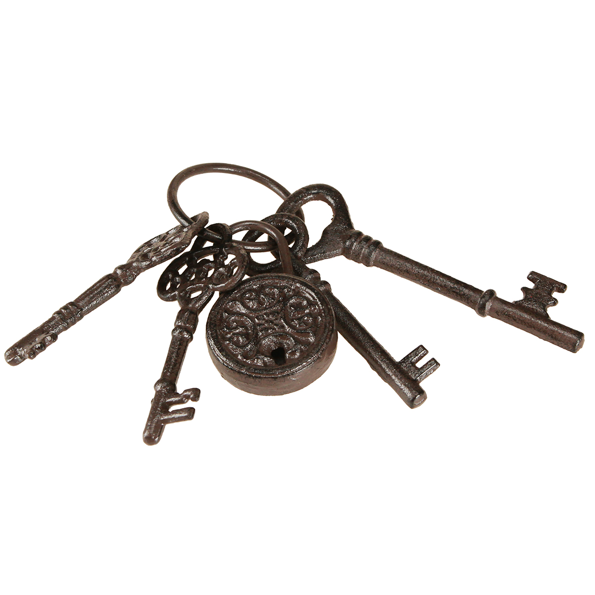 Förfina din vintagedekoration med denna originalnyckelring på en metallring i brunt! De enskilda nycklarna och ringen i denna hängande eller bordsdekoration är gjorda av gjutjärn. De enskilda elementen är målade i en mörkbrunt, vilket också skapar den halkfria patinan på ytan. Detta gör att de dekorativa nycklarna och låset ser konstgjort åldrade ut, vilket ytterligare understryks av de individuella skäggens vintagedesign.