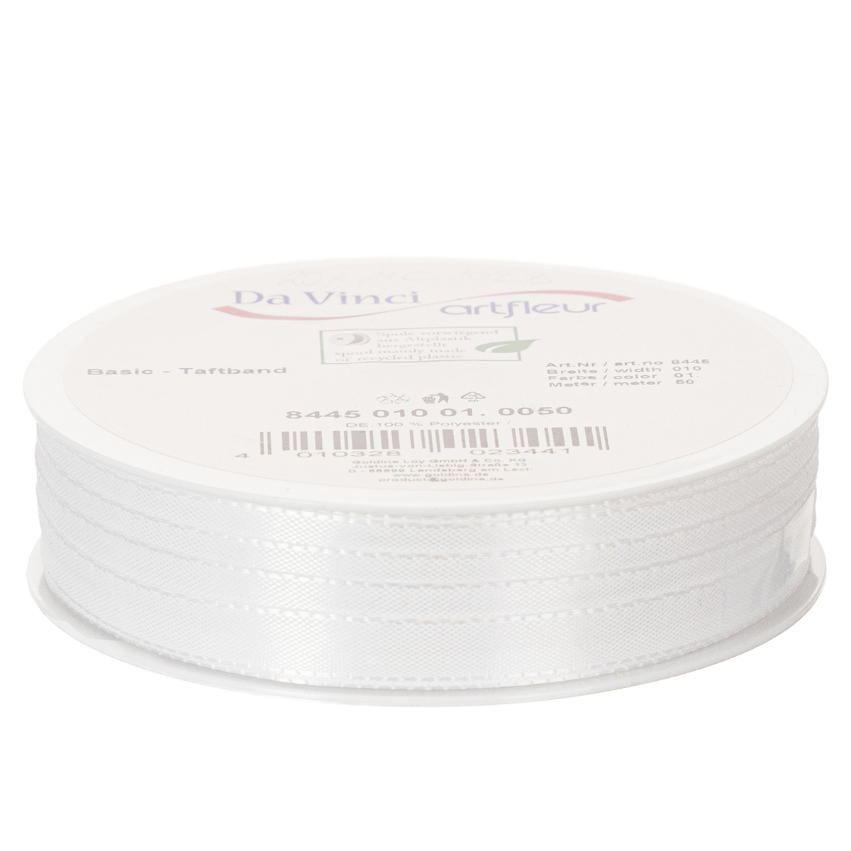 Produktnamn: Dekorativt taftband, vitt, 10 mm brett, 50 m långt