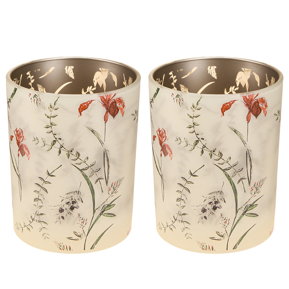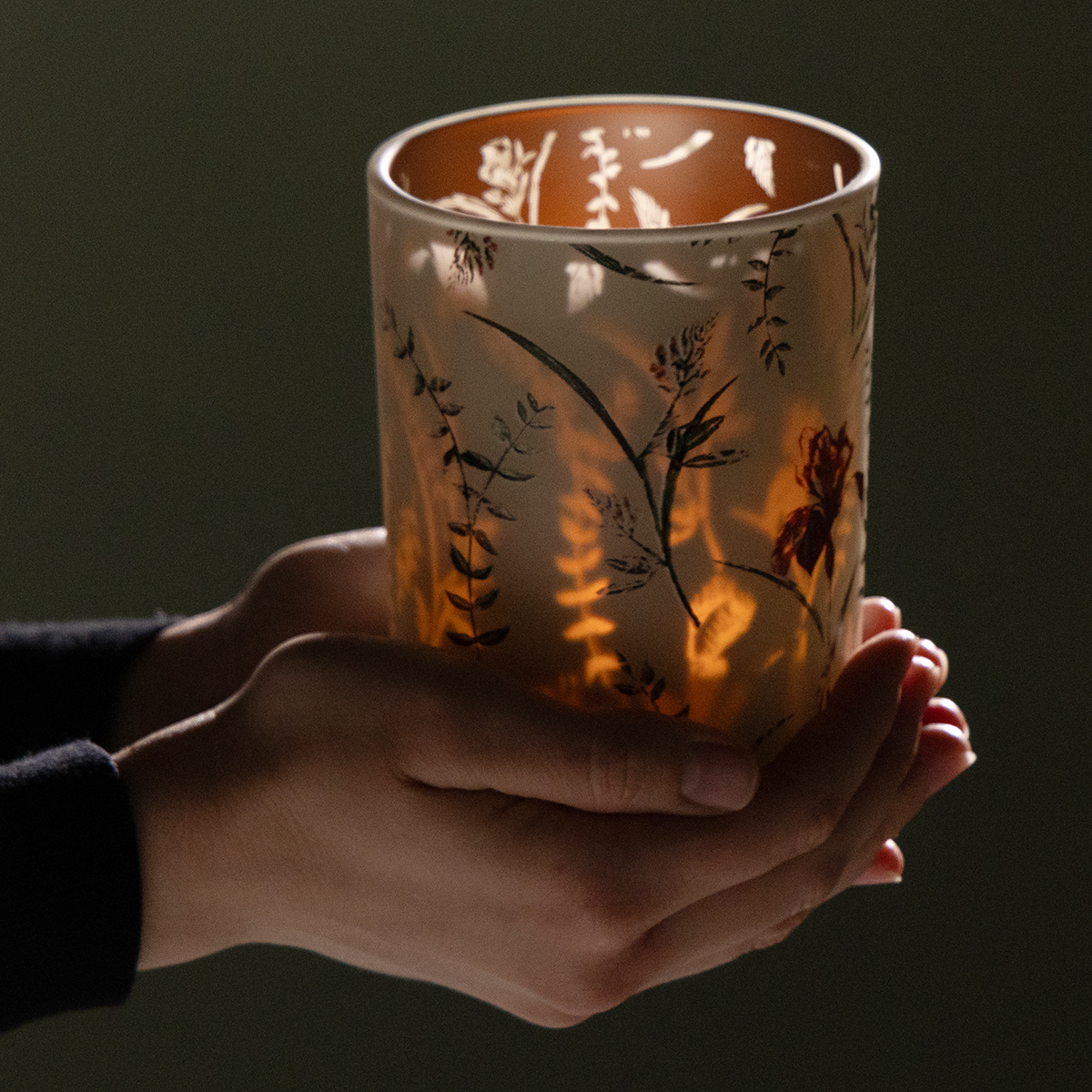 Denna eleganta ljusstake med blommönster är mer än bara ett enkelt föremål – den är en riktig blickfångare! Det delikata växtmönstret i beige toner påminner om mjuka akvareller, vilket ger ljusstaken en naturlig men sofistikerad karaktär. Den metallbelagda innerkanten reflekterar levande ljuset på ett sätt som skapar en fängslande atmosfär. Helt enkelt magisk för mysiga kvällar i vardagsrummet eller på uteplatsen!