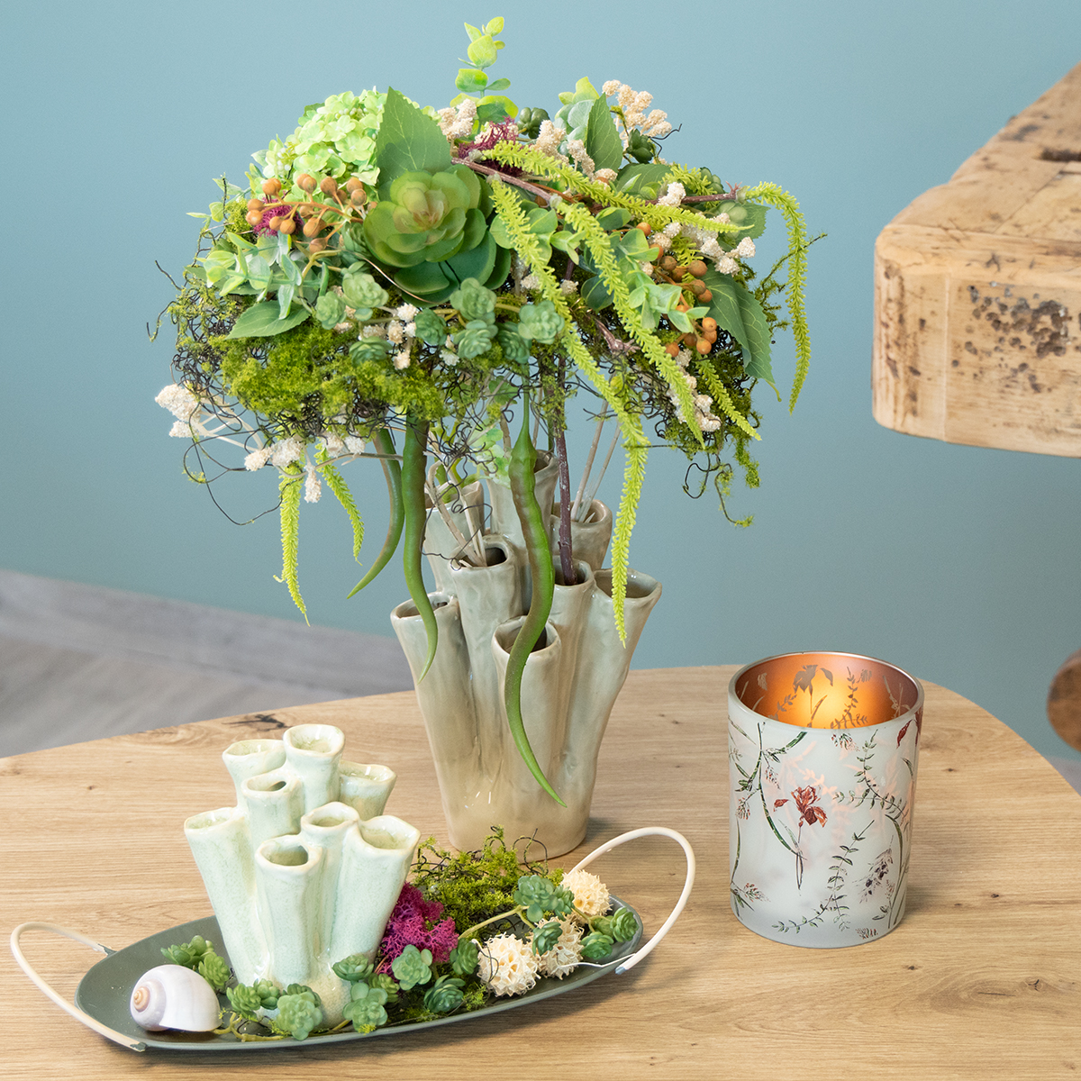 Få in det milda samspelet mellan ljus och elegans i ditt hem med vår eleganta blommiga ljusstake! Älskar du att skapa en varm och harmonisk atmosfär i ditt vardagsrum, på din uteplats eller vid ditt festbord? Då kommer du att bli förtjust i denna förtrollande dekoration. Med en höjd på 12,5 cm och en naturlig beige nyans smälter ljusstaken sömlöst in i alla inredningsstilar. Speciellt när ljuset inuti lyser mjukt skapar den en vacker effekt som badar rummet i ett varmt och inbjudande ljus.