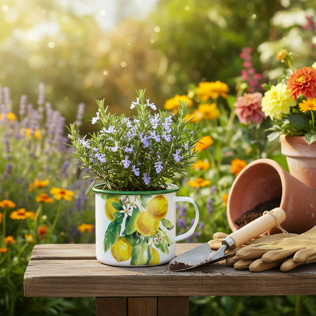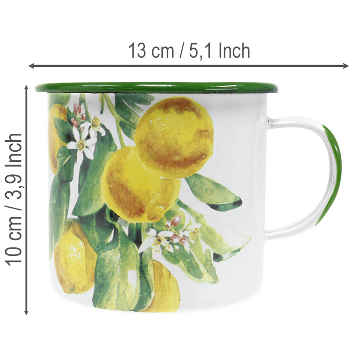 I denna emaljplanteringskopp kan du presentera en liten blomma eller örtväxter på ett väldigt elegant sätt. Den dekorativa koppen med citrongren passar fantastiskt bra som medelhavscachepot!
