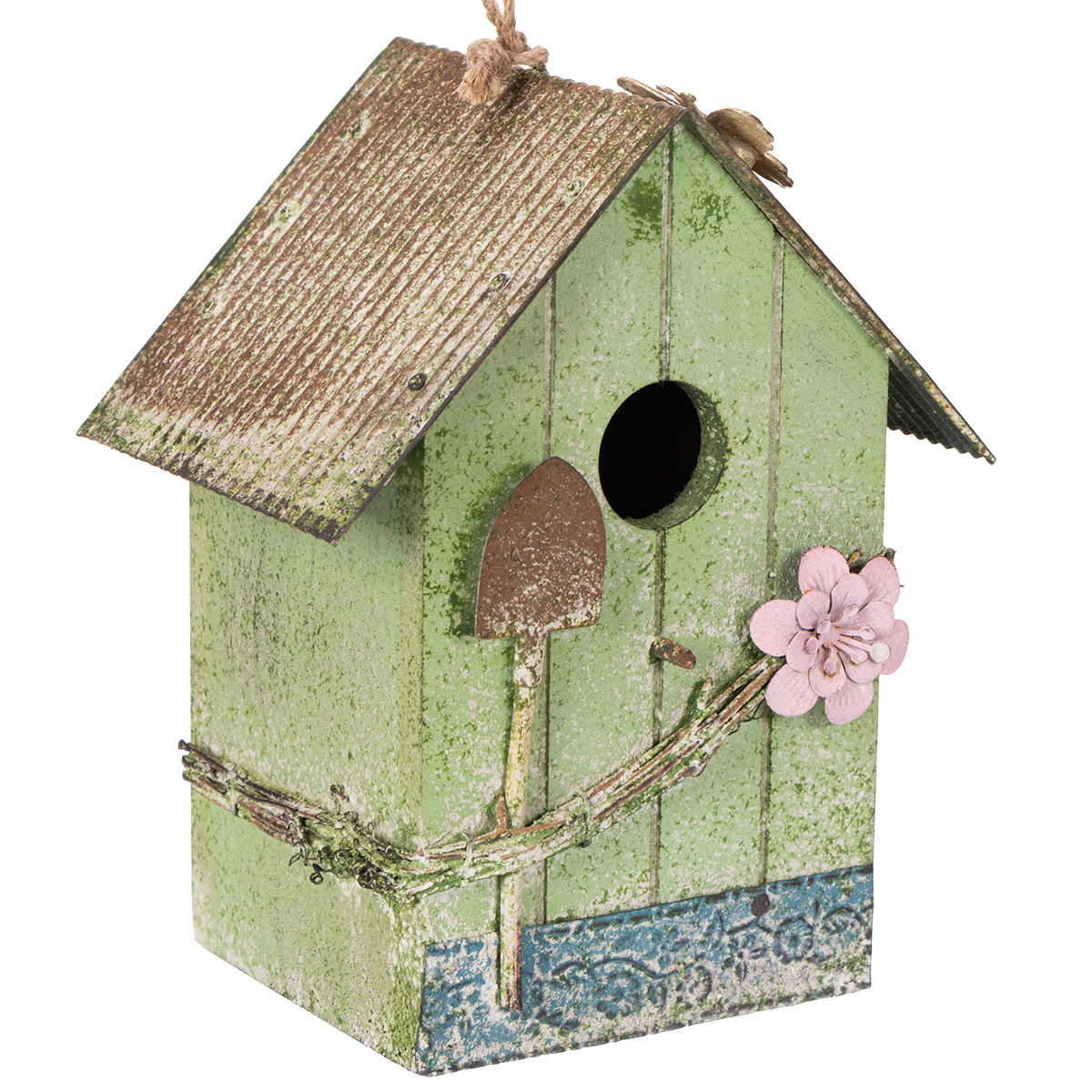 Fågelholk med blomsterdekoration, romantisk lantställedekoration, 19 cm