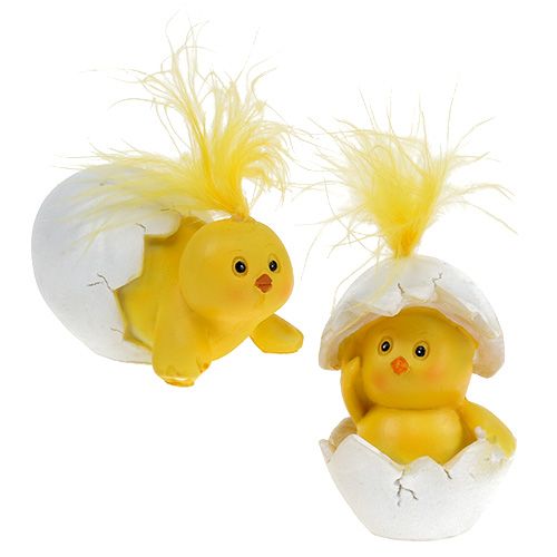 Dessa gula kycklingar i ägget är otroligt söta: Uppsättningen 4, som du får här, innehåller 2 olika varianter av dekorativa fåglar. Medan en kyckling kryper ut ur sitt vita äggskal, sitter den andra fortfarande i den ena halvan av skalet med en äggskalhatt på huvudet och skrapar huvudet nästan lite hjälplöst - som om det förvånade sig själv, plötsligt för tittaren att sitta mittemot. Båda polyresinfigurerna är dekorerade med orange näbb, stora svarta ögon och riktiga gula fågelfjädrar på huvudet.Använd påskdekorationen genom att placera en av ljudsignalerna eller båda varianterna i en påskkorg, dekorera en byrå eller en hylla med den eller ge bort de dekorativa kycklingarna i en komplett uppsättning som gåva. De dekorativa djuren ser också riktigt retande ut i en korg fylld med grönt påskgräs eller i en planterad blomkruka - prova själv! Med sina runda ansikten och söta ansiktsuttryck garanterar du alla tittare.