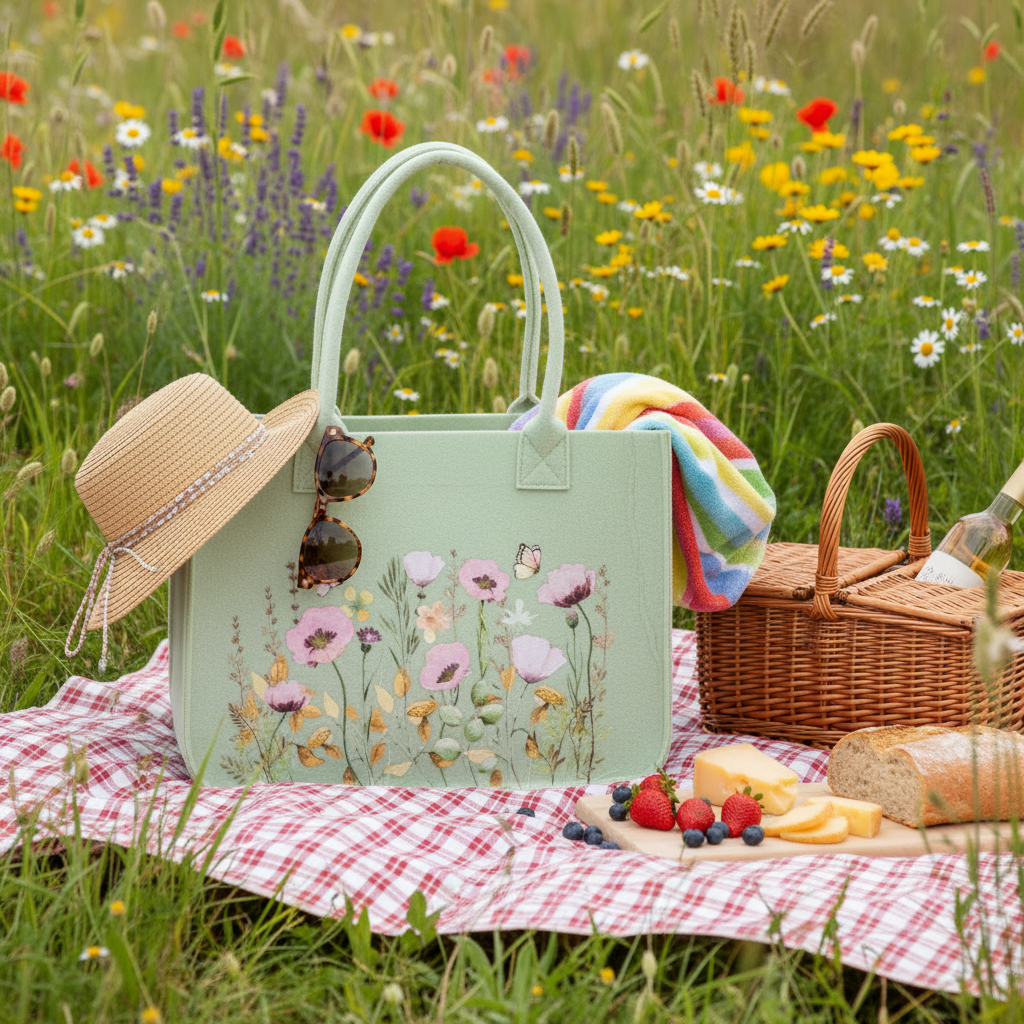 Tillverkad av robust filt i en elegant grön nyans, ger denna väska en touch av naturen och utstrålar somrig charm. Det kärleksfullt designade blommönstret på framsidan ger den ett unikt utseende som påminner om blommande sommarängar. Denna väska är perfekt för nästan alla vårdekorationer. Och det bästa av allt?