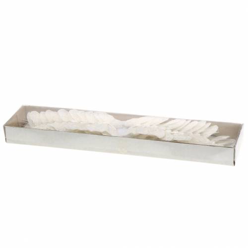 De glittrande dekorativa fjärilarna av vita fjädrar med tråden levereras i en låda med totalt 24 stycken. Varje fjäril är cirka 5 centimeter bred och 4 centimeter hög, den totala längden med tråd är cirka 24 centimeter.