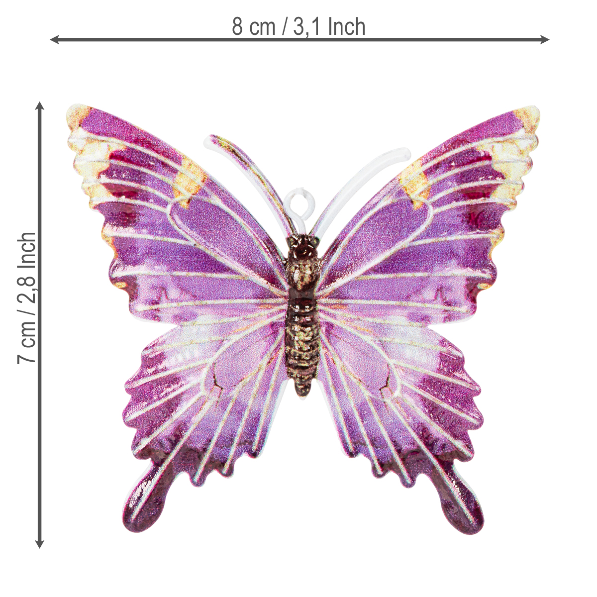 Detta fjärilshänge imponerar med sin harmoniska kombination av funktionalitet och estetisk charm. Med en höjd på 8 centimeter och en bredd på bara 0,5 centimeter är de varken för små eller för stora – perfekt proportionerade för fönsterdekorationer, väggkonst eller för att hänga på grenar eller kvistar. Deras lätta vikt gör att de kan placeras var som helst utan att lägga till någon vikt.