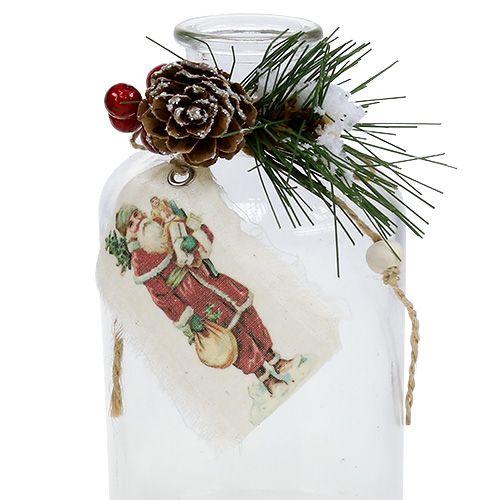 Båda kärlen är prydda på halsen med röda bär och tallgrenar gjorda av plast, och var och en med en äkta, liten kon, dessa accenter är också täckta med konstgjord snö eller silverglitter. Dessutom finns det en naturfärgad jutebåge på flaskhalsarna, på vilken det finns en ljus träpärla och en kärleksfullt utformad jultomtenbild tryckt på tyg. Resultatet är en övergripande bild skapad med stor uppmärksamhet på detaljer, som på julafton inte bara dekorerar presentbordet utan också kan ges bort till en av dina nära och kära.