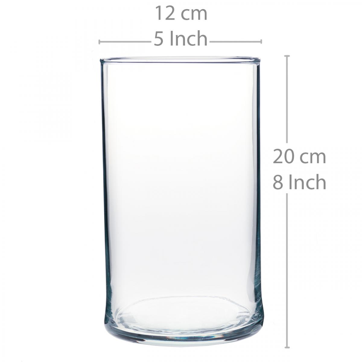 Den cylindriska glasvasen är cirka 20 centimeter hög och har en diameter på cirka 12 centimeter.