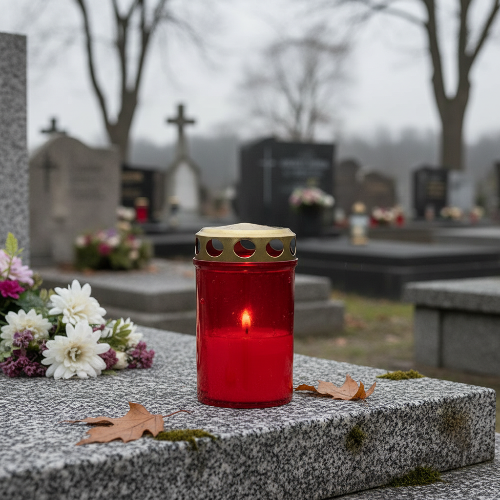Med detta cylindriska gravljus i rött kan du genomföra en graciös gravdesign och fylla på gravlyktor. De praktiska gravstearinljusen består av vitt ljusvax, ett rött plastöverdrag och är färdiga med ett gyllene lock, som har praktiska lufthål på sidorna. Detta skyddar ljuset från vind och väder, samtidigt som det lugnt belyser graven. Du har också möjligheten att införliva gravljusen i en begravningsarrangemang för att designa en minnesgud i enlighet därmed.