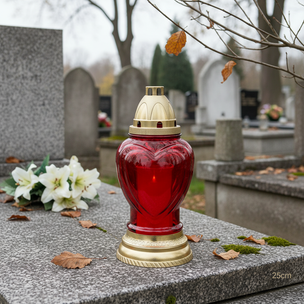 Gravlyktan är dekorerad med en tidlös hjärtrelief på båda sidor, vilket ger gravljusen ett elegant utseende. Locket och basen är tillverkade av plast och är också vackert formade.