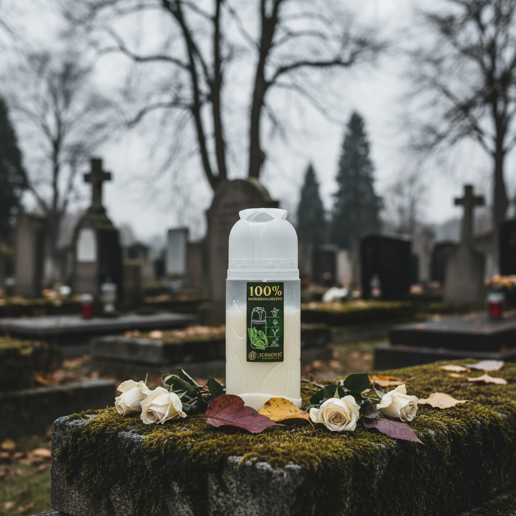 Det speciella med detta gravljus är dess genomskinliga lock av 100 procent komposterbar plast, vilket gör ljuset till en miljövänlig följeslagare för varje grav. ICP-sigillen bekräftar att ljuset är industriellt komposterbart och därför uppfyller din önskan om ett hållbart liv, även som souvenir.