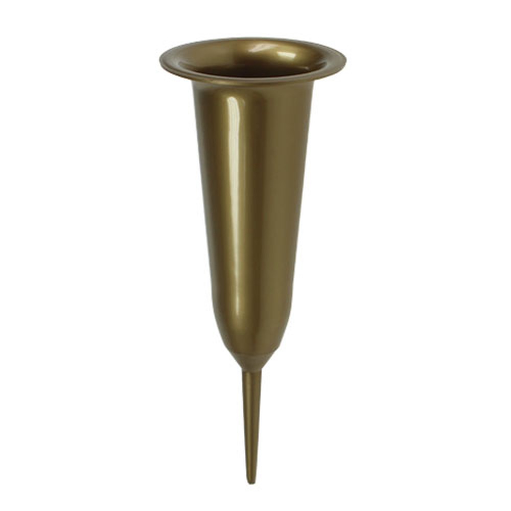 Det finns en bred kant på toppen, som sedan håller en begravningsbukett i form och också gillar att stödja de tunga blommhuvudena. Plastvasen ger tillräckligt med utrymme för vattenbehållaren och tillhörande näringsämnen. Du kan också använda torra växter och sidenblommor för gravdekorationen, som också markeras av den gyllene färgen.
