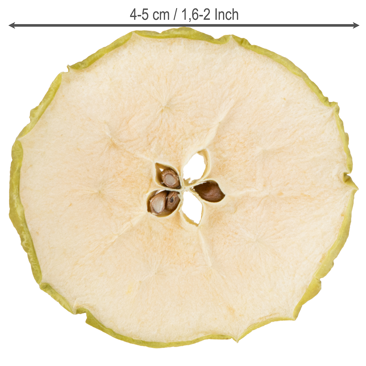Varje 500 gram paket innehåller flera röda äppelskivor för dekoration, alla är naturligtvis något olika storlekar. Skivorna har en diameter på cirka 4 till 5 centimeter och är en extraordinär effekt som dekoration på bordsskivan vid matbordet, vilket är oöverträffat.
