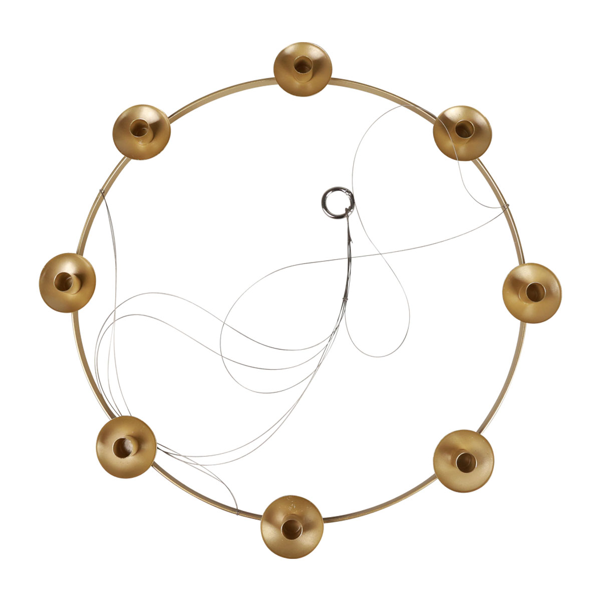 Gillar du det nostalgiskt och romantiskt över ditt julbord? Vad sägs om en guldhängande ljuskrona för semestern? Den hängande ljusstaken rymmer åtta smala ljus.De åtta pinnljushållarna placeras på en ring med en rund platta. Du kan hänga ringen på det tunna silverrepet. Spännet i änden av repenheten är gjord som en karbinhake. Med ett enkelt klick kan den hängande ljuskronan fästas var som helst.