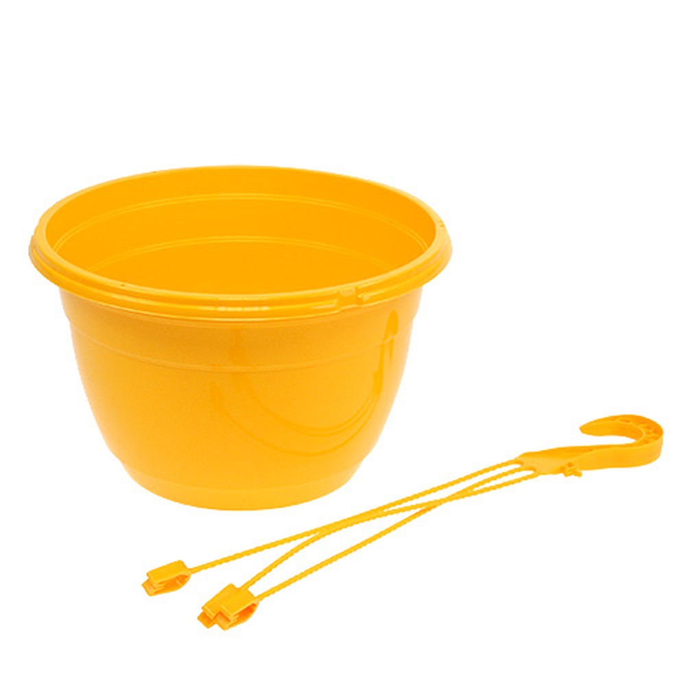 Den gula hängkorgen av lätt men slitstark plast har en ytterdiameter på cirka 25 centimeter, en innerdiameter på cirka 23 centimeter och en basdiameter på cirka 15 centimeter. Själva blomkrukan är cirka 15,5 centimeter hög, med den totala längden runt 50 centimeter. Observera att den hängande korgen levereras utan fat och är därför endast lämplig för utomhusbruk.