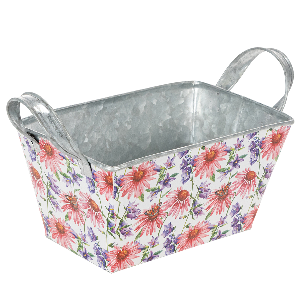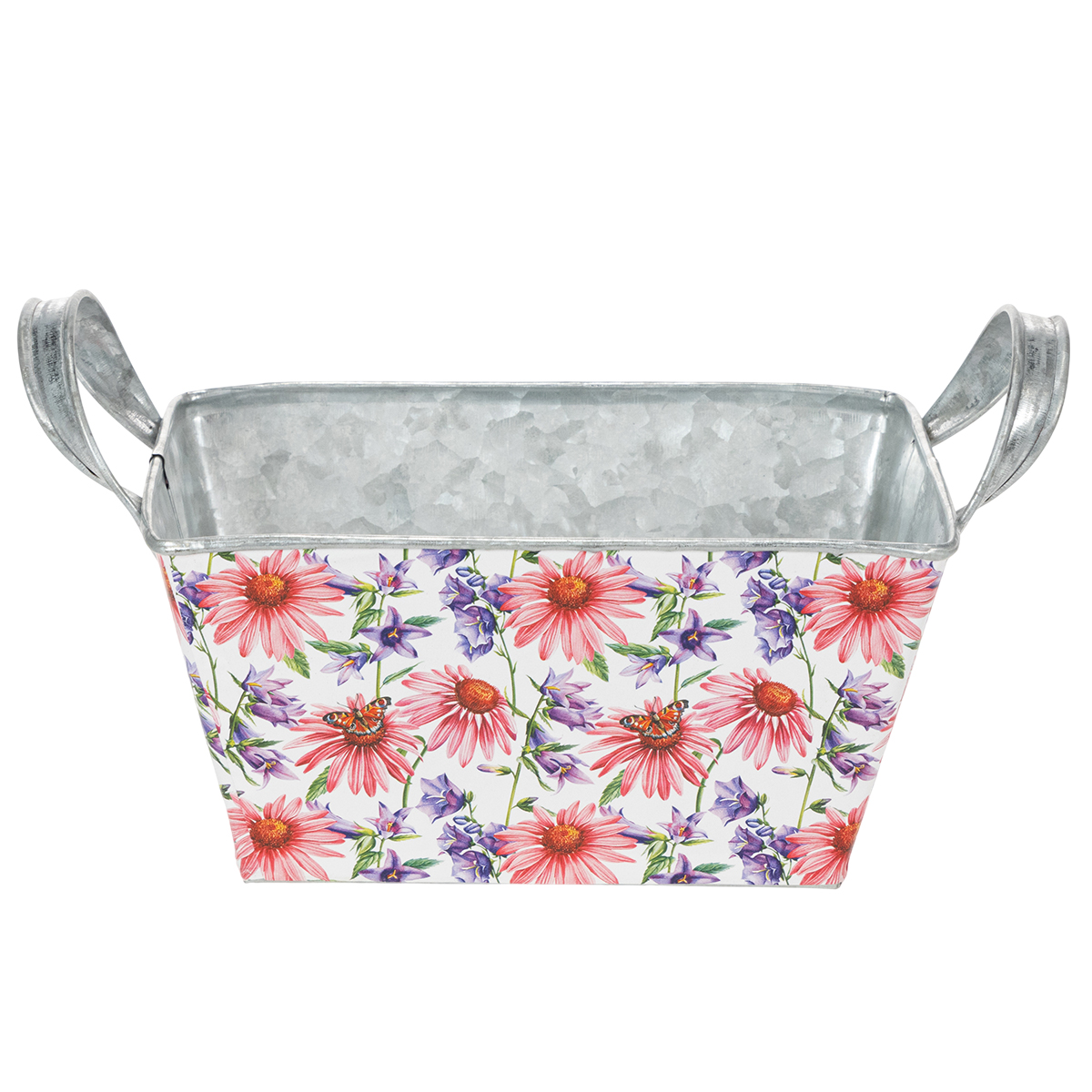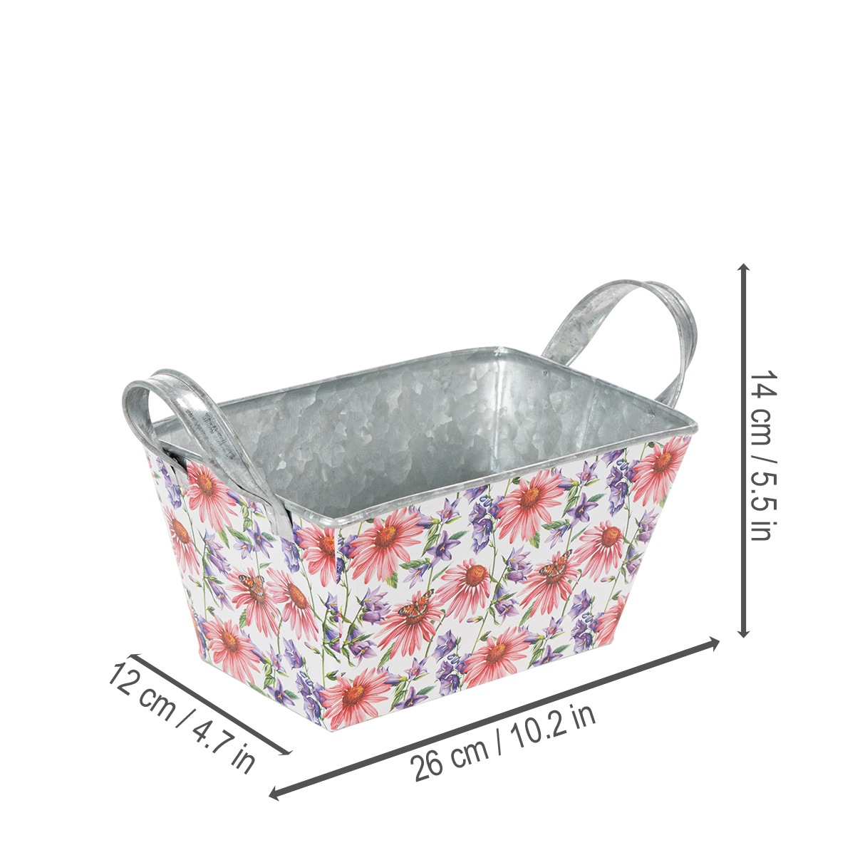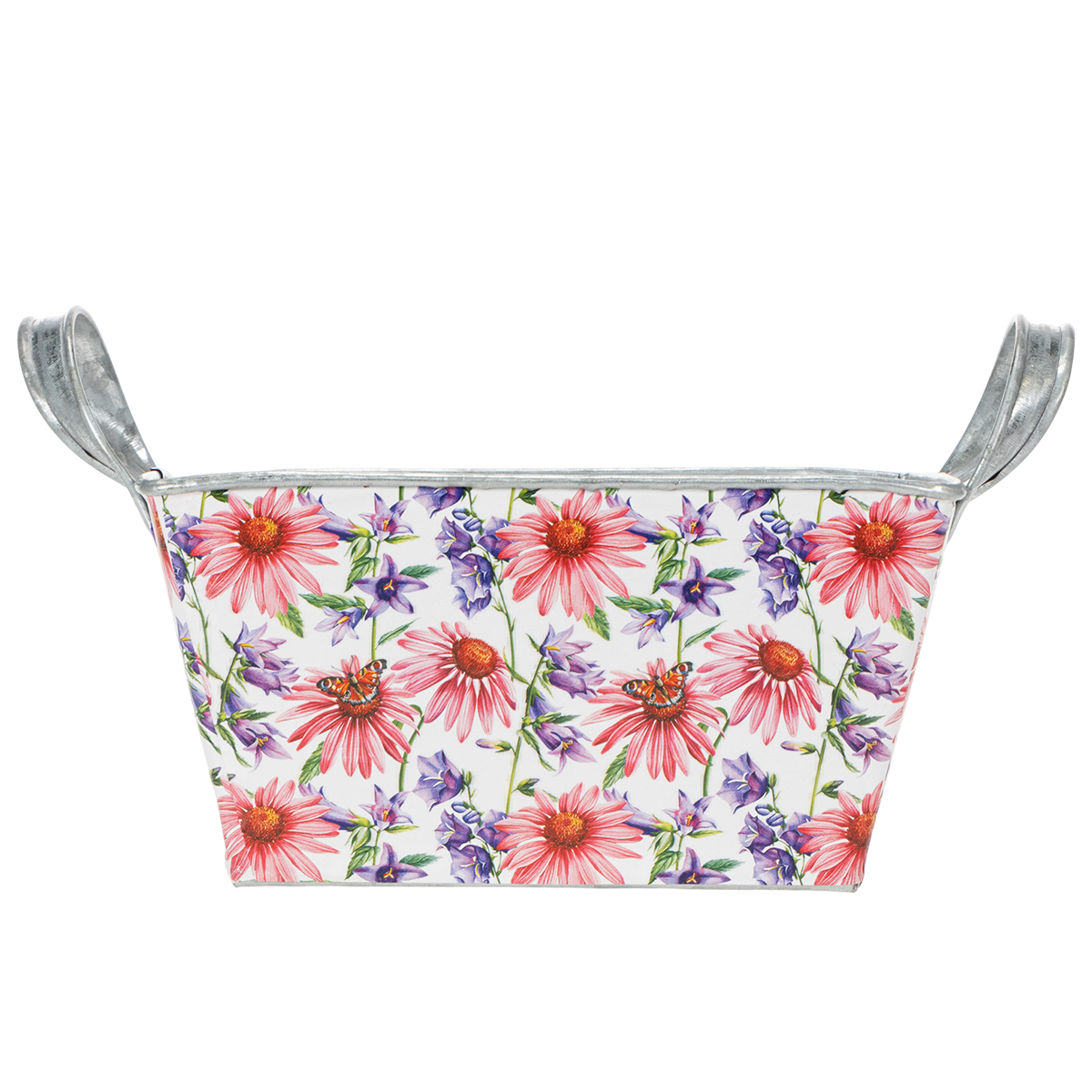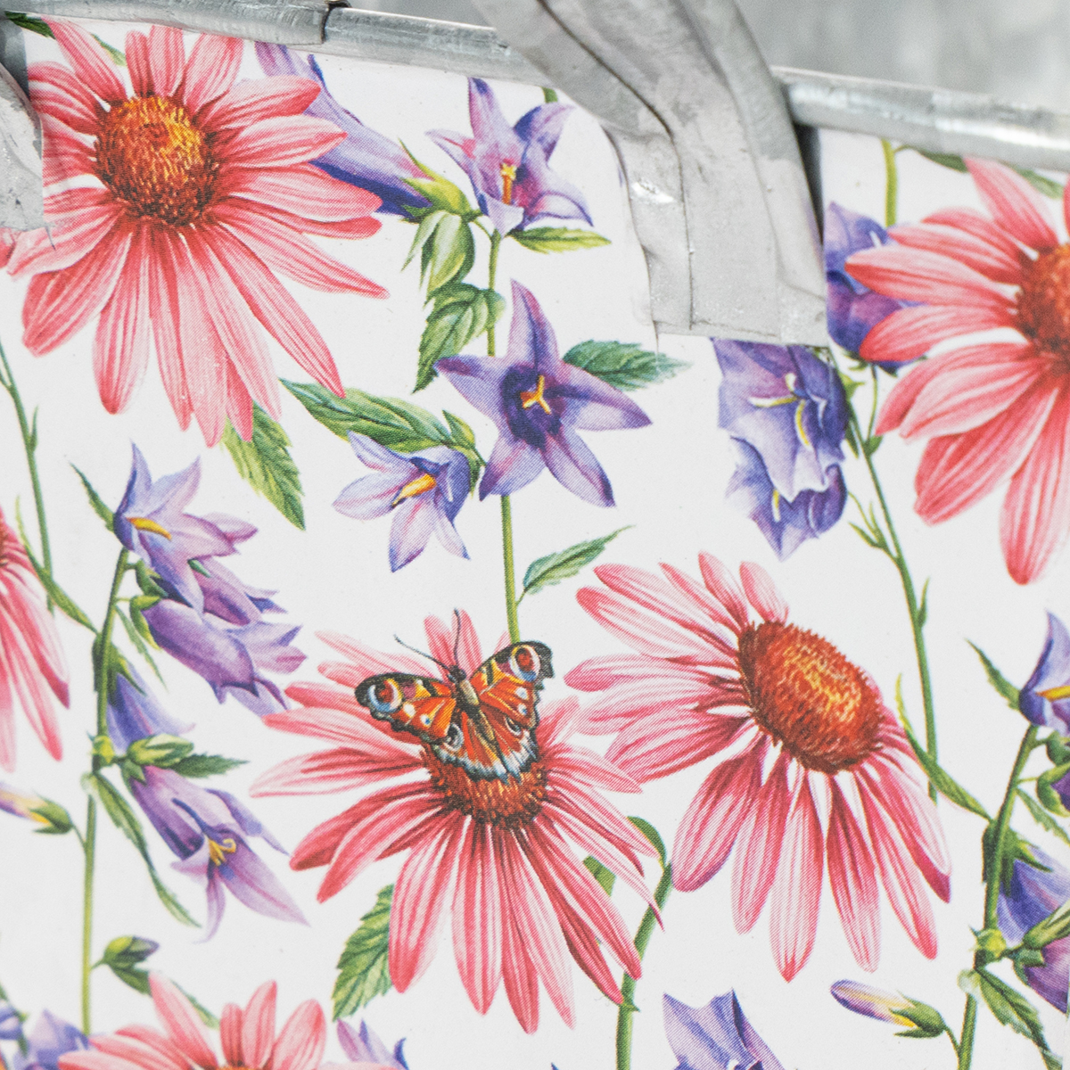 Rosa och lila vårblommor på vit bakgrund skapar en varierad och optimistisk ram. Blommotivet har tryckts på en stadig folie, som i sin tur fastnar på zinkkärlet. På så sätt bildar insidan med den silverfärgade zinken en stark kontrast i vårdekorationen.