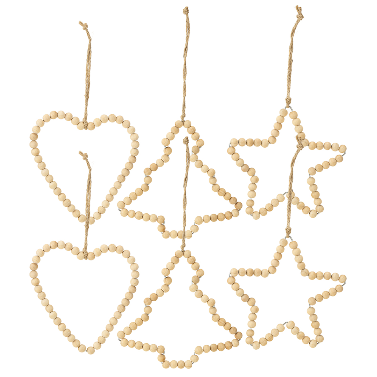 Juldekorationer: träpärlor, hjärta, stjärna, träd, 13 cm höga, 6 stycken