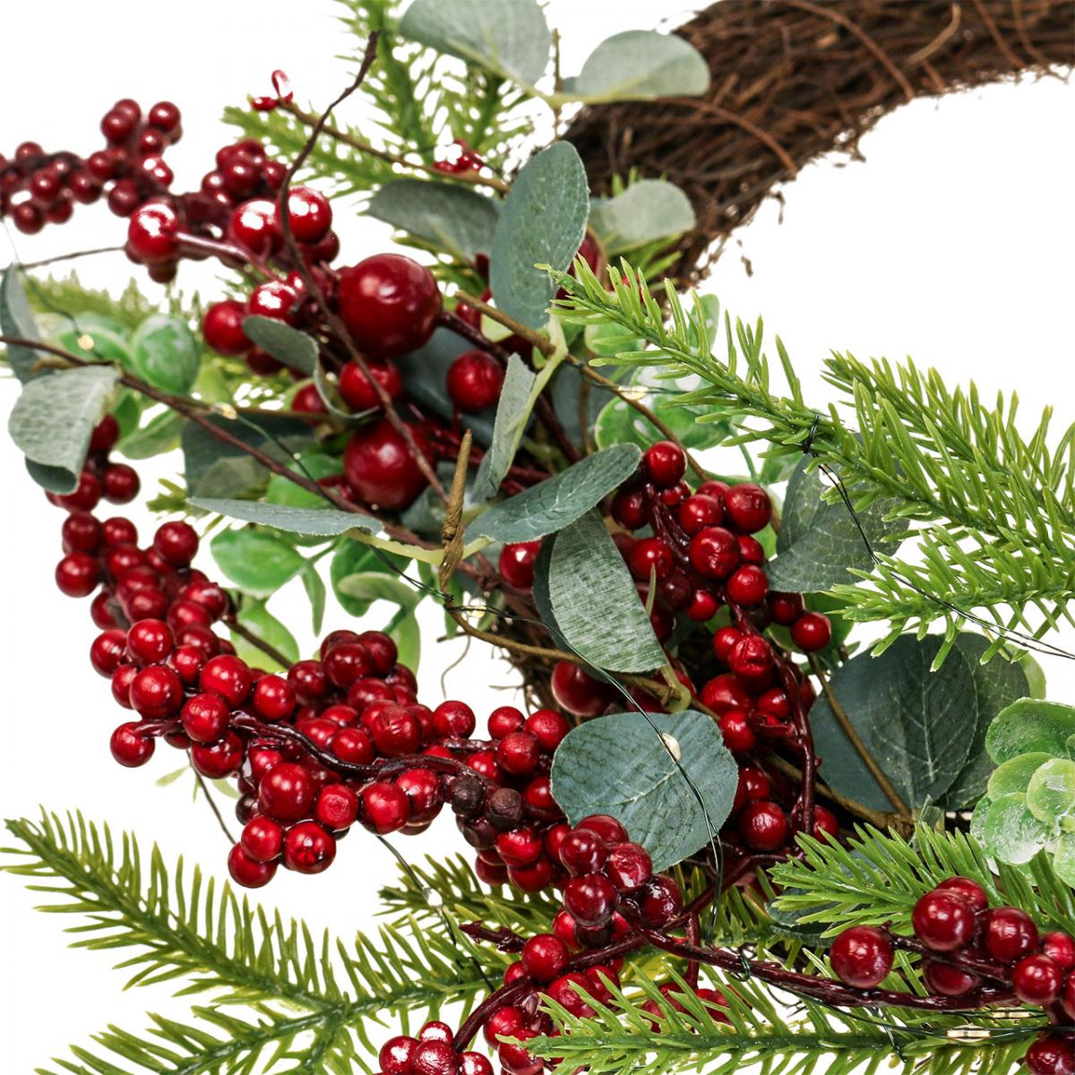 De konstgjorda gran-, eukalyptus- och bärdekorationerna och LED-ljuskedjan pryder dörrkransen inför vintern på ett enkelt men festligt sätt. Du kan även dekorera kransdekorationen ytterligare efter dina önskemål med små dekorativa galgar, band, julgranskulor eller klockor.