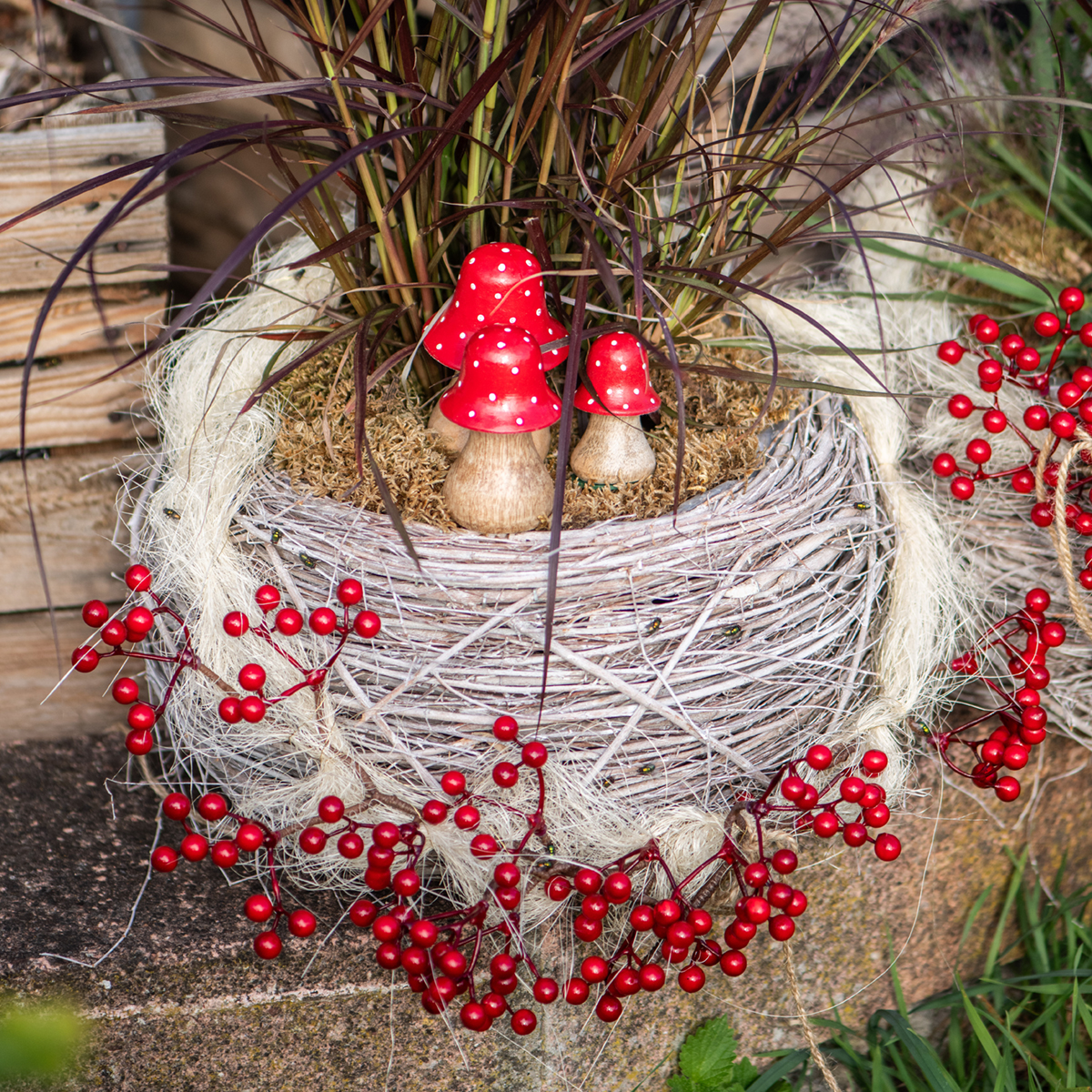 Material: Trä, plast (t.ex. PE, PP), glas, keramik, metall, textilier, frigolit eller naturmaterial (t.ex. kvistar, bark, mossa, kottar).
