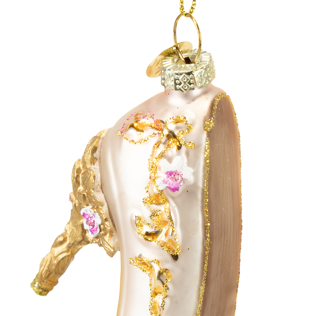 Varje julgransdekoration har en speciell historia – och dessa vackra glasskor är inget undantag! Deras fina detaljer, som konstfullt skulpterade gyllene blomsterdekorationer, gör dem verkligt speciella. Deras upphängningsögla gör dem enkla att fästa på grenar, girlanger eller till och med dekorativa kvistar i en vas. Den delikata rosenfärgade ytan har en behaglig satinfinish, som i kombination med guldet skapar ett festligt och harmoniskt färgschema. Plastklackarna ger skorna extra stabilitet utan att förringa det eleganta helhetsintrycket.