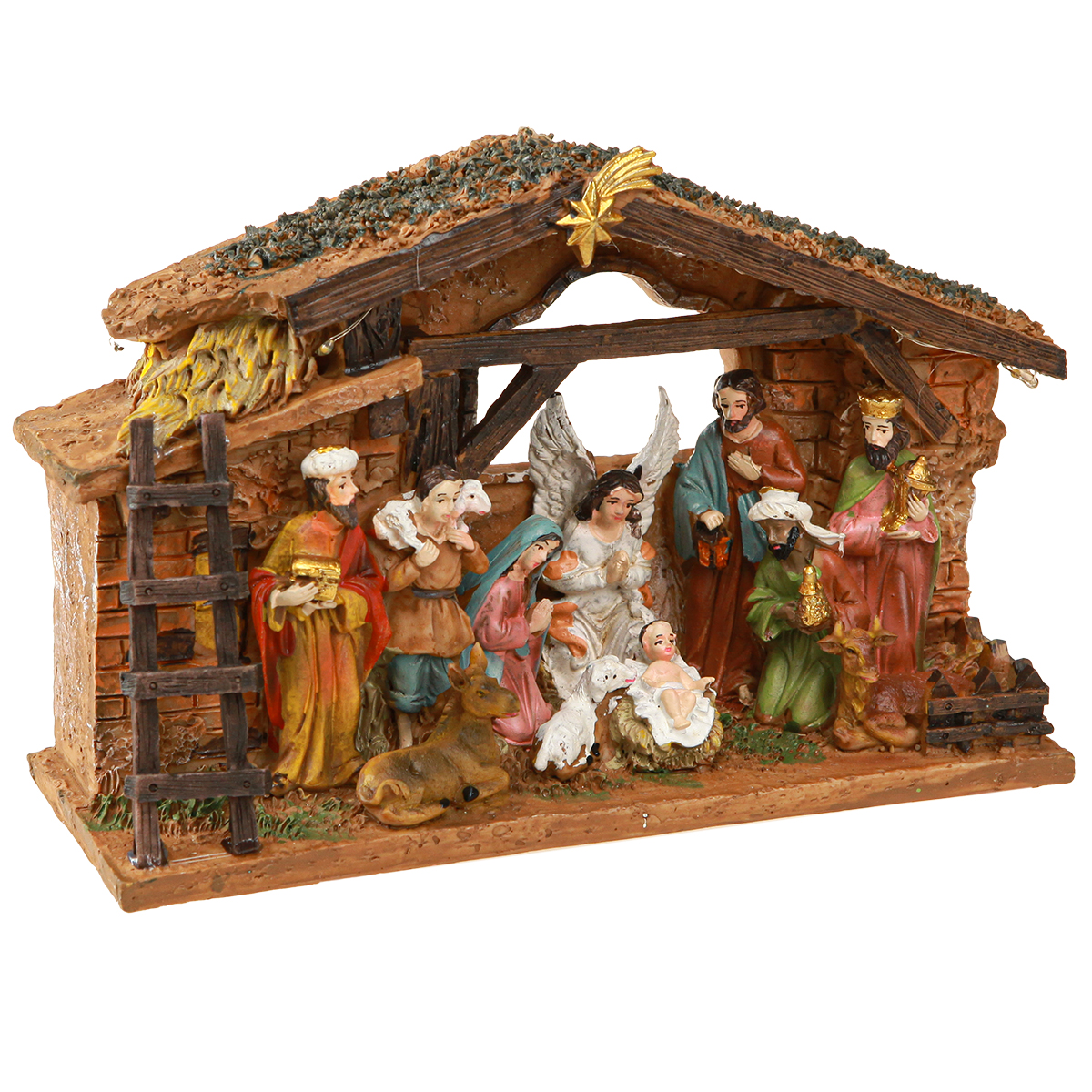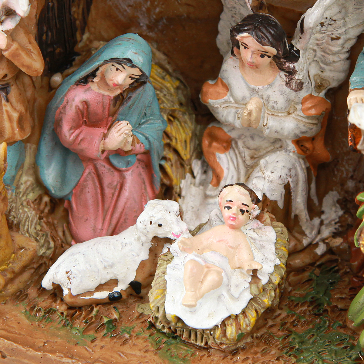 - Många figurer: herdar, änglar, tre kungar