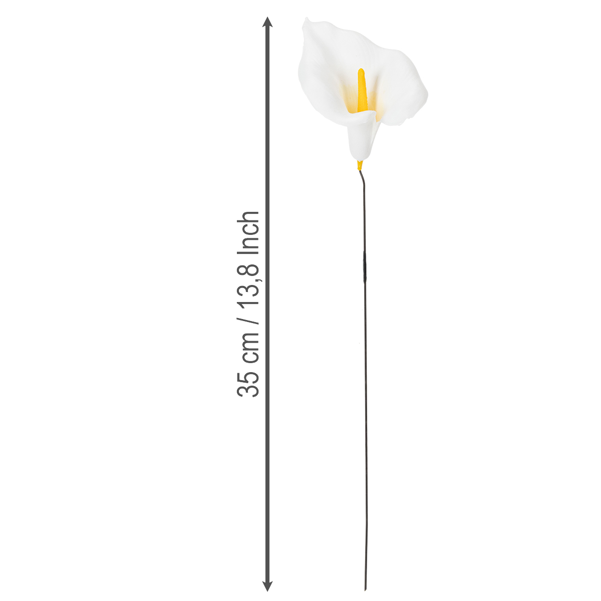 Den lilla callaen på tråden i vitt är i en påse med 50 stycken. Den totala längden på varje artificiellt träskkala är cirka 35 centimeter, den bruna och flexibla metalltråden är cirka 27 centimeter lång. Det vita blommahuvudet har en längd på cirka 10 centimeter och i mitten har det också en mycket snyggt imiterad gul pollenstång, vars omgivande tratt också är något gulfärgad.