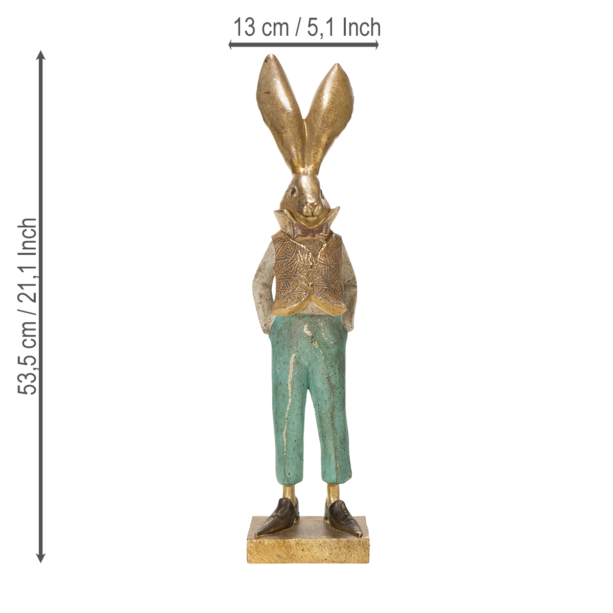 Denna kaninfigur imponerar med sin harmoniskt koordinerade design. Den varma bruna tonen på kroppen och den delikata gröna färgen på byxorna skapar en behaglig kontrast som framstår som både modern och tidlös. Särskilt de polerade detaljerna i polystone ger figurinen ett livfullt och naturtroget utseende. Har du lagt märke till hur kärleksfullt de små detaljerna har placerats? Från det charmiga ansiktsuttrycket till de gyllene accenterna på dess klädsel – här möter klassisk påskdekoration modern elegans.