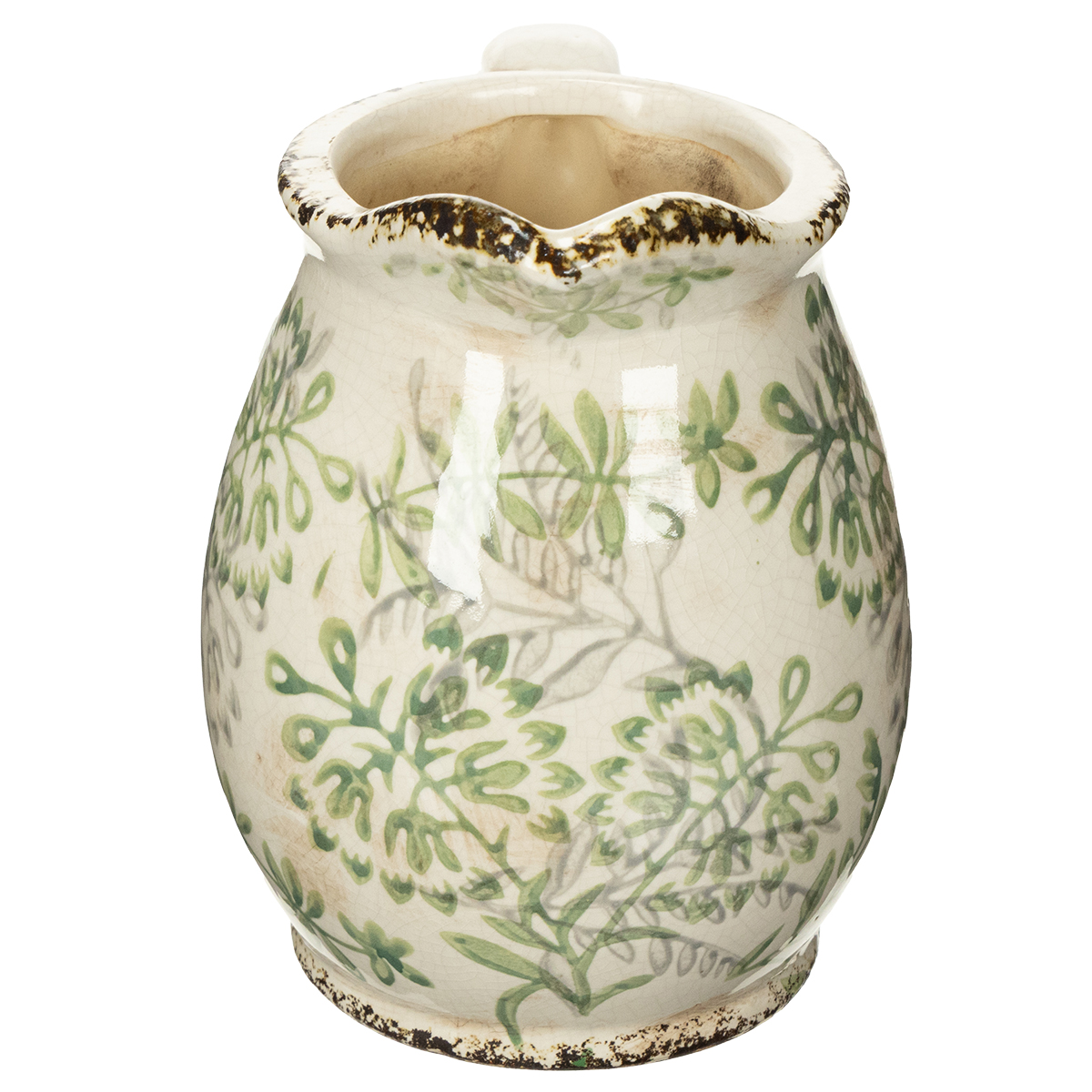 Älskar du charmen från svunna epoker och vill få in en touch av vintage-atmosfär i ditt hem? Då är denna förtrollande vintage-kruka precis vad du letar efter! Den kombinerar nostalgisk charm med praktisk funktionalitet och kommer att bli ett riktigt blickfång i alla miljöer. Den keramiska krukan imponerar med sin vita basfärg, prydd med subtila gröna växtmotiv. De avsiktligt slitna, lätt avskalade kanterna bidrar till dess charm och framhäver perfekt dess antika karaktär. Oavsett om den står på fönsterbrädan, som en nostalgisk bordsdekoration eller fylld med färska örter i köket – denna dekorativa kruka i lantlig stil är otroligt mångsidig. Placera helt enkelt din favoritbukett, en växt eller doftande örter inuti för att skapa ett härligt arrangemang.