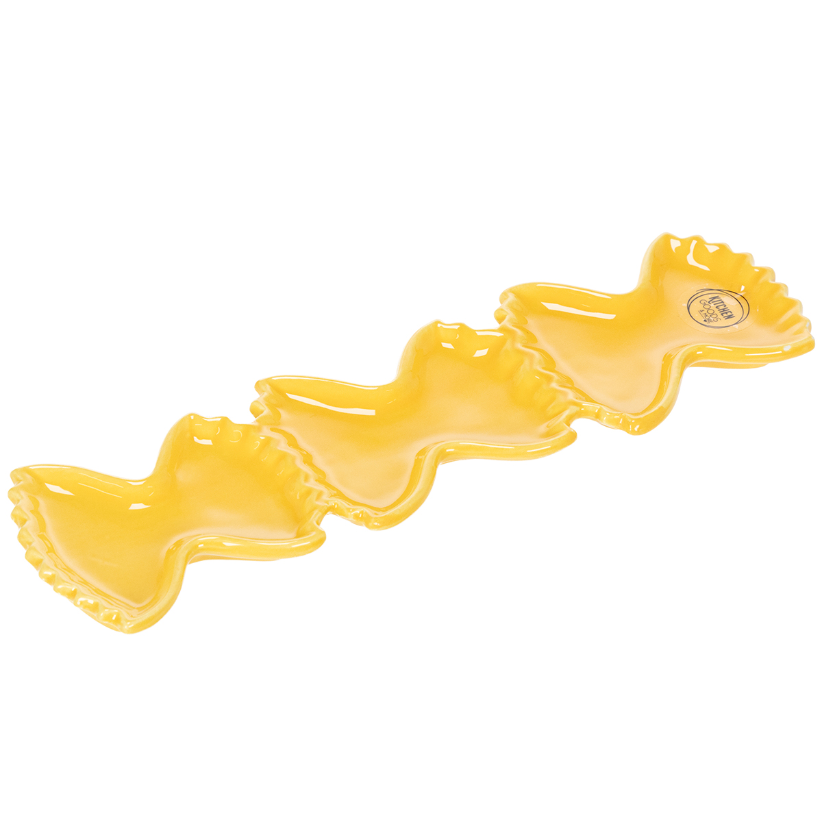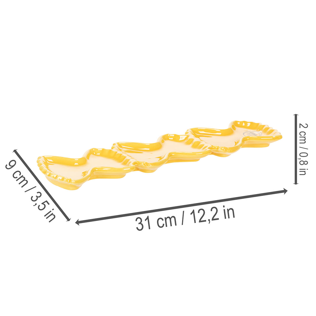 Denna keramiska dippskål är 31 cm lång och 9 cm bred och erbjuder gott om plats för dina små favoriträtter. Skålens lekfulla pastaform ger den en charmig karaktär och gör den till ett riktigt blickfång i vilken dukning som helst. Kombinerat med andra gula accessoarer, som pastavaserna från vår kollektion, blir ditt bord ett harmoniskt konstverk, perfekt anpassat till en medelhavs- eller somrig stil.