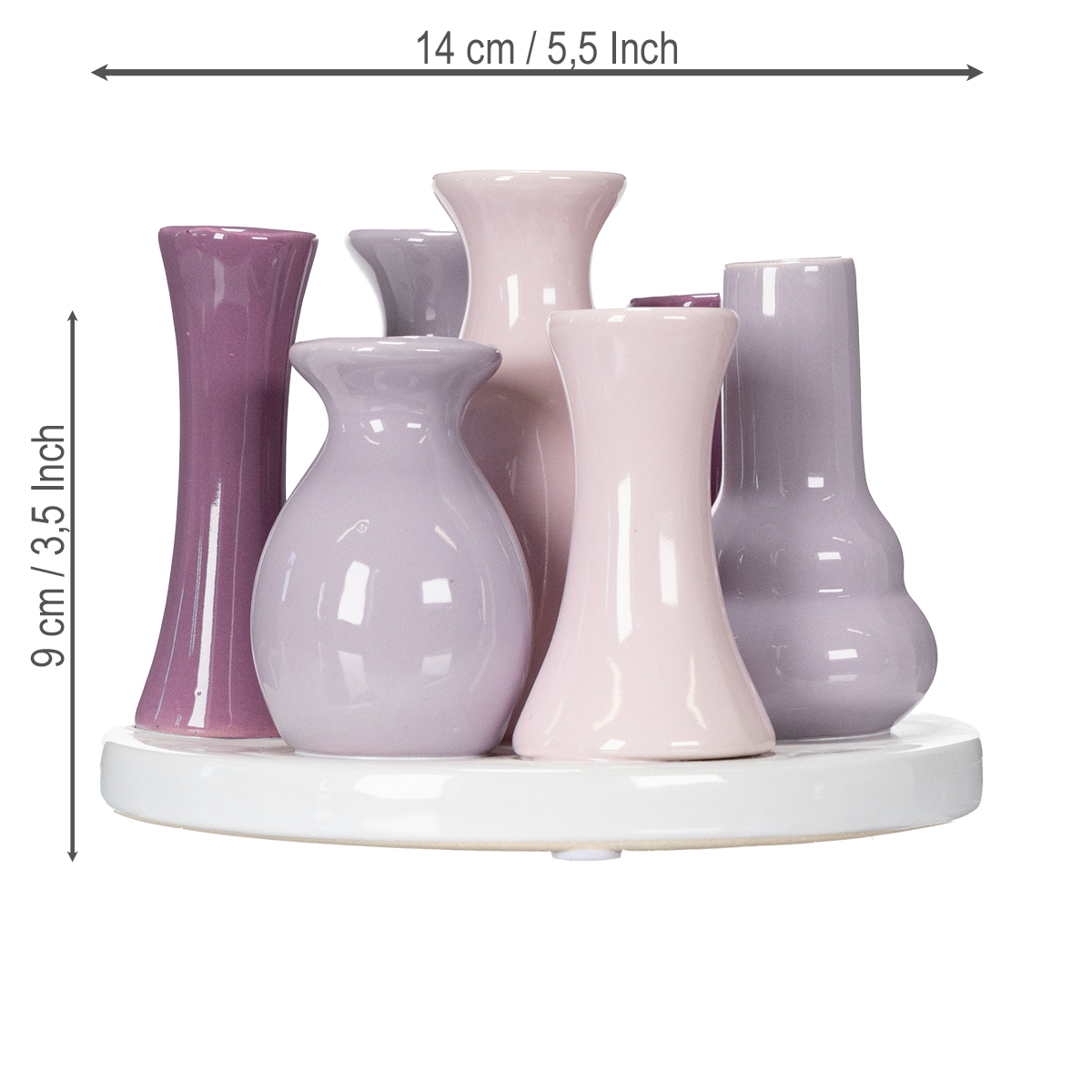 Letar du efter en speciell touch till ditt hem? Något som tillför fräschör, elegans och en antydan till modernitet? Detta pastellfärgade vasset av högkvalitativ keramik kan vara precis vad du letar efter. De sex konstfullt formade vaserna, i kombination med en robust vit keramikbas, garanterar mångsidig användning – från bordsdekorationer till iögonfallande hylldekorationer. Oavsett om de är fyllda med färska blommor, små buketter av torkade blommor eller helt enkelt visas individuellt som eleganta dekorationer, ger dessa små vaser alltid den perfekta touchen. Den harmoniska färgpaletten i rosa och lila skapar en lugnande men ändå inbjudande atmosfär. Ett perfekt val för alla som uppskattar stil och funktionalitet och vill ge sitt vardagsrum ett modernt utseende.
