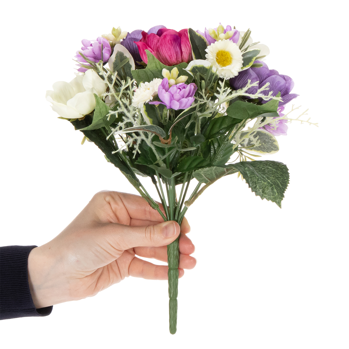 En konstgjord blombukett som inte bara är dekorativ utan också ger bestående glädje. Denna modell, tillverkad av polyester och plast, erbjuder ett hållbart alternativ till riktiga blommor och är perfekt för alla som vill njuta av vårblommornas glada känsla utan att ständigt behöva köpa nya buketter. De livfulla färgerna – från mjukt vitt till strålande violett och djärvt rosa – gör denna färgglada konstgjorda blombukett till ett riktigt blickfång.