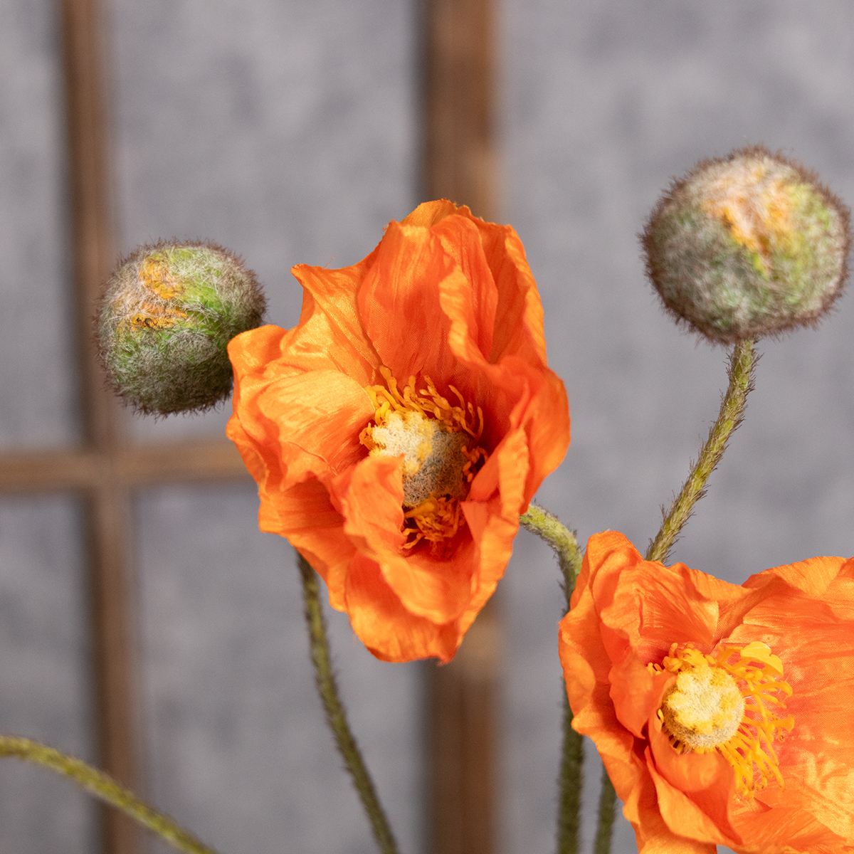 Den varma orangea färgen harmoniserar vackert med naturliga trätoner, guldfärgad inredning eller minimalistiska svarta möbler i modern stil. Vårt tips: Kombinera vallmobuketten med fina vita torkade blommor eller gröna konstgjorda växter för ett livfullt och balanserat utseende. Speciellt vid festliga tillfällen som middagsbjudningar eller bröllop blir buketten ett riktigt blickfång på bordet.