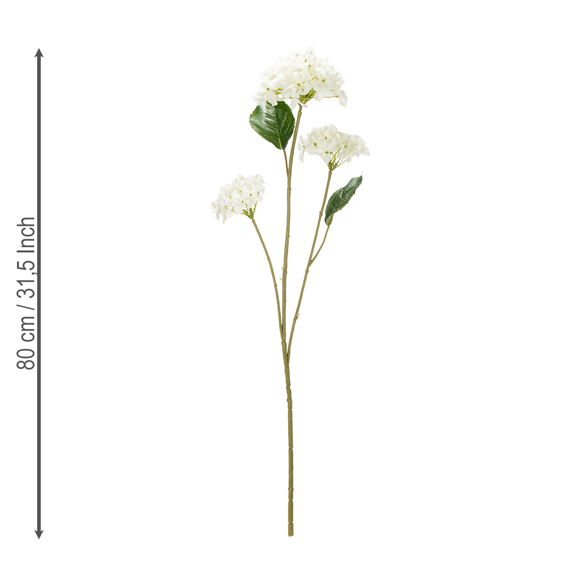 Har du någonsin undrat hur du med minimal ansträngning kan ge ditt hem en elegant och tidlös touch? Då kan konstgjorda hortensior vara precis vad du letar efter! Denna vita konstgjorda blomma imponerar med sitt förvånansvärt realistiska utseende och mångsidighet. Oavsett om den är en höjdpunkt i moderna vardagsrum, som en del av ett elegant bordsarrangemang eller som en imponerande accent i receptionen – denna hållbara, dekorativa blomma smälter perfekt in i alla miljöer. Tre frodiga blommor och två gröna blad pryder en delikat stjälk, vilket ger arrangemanget ett särskilt naturligt utseende. Med en höjd på 80 cm och en bredd på 30 cm är den idealisk för större vaser eller dekorativa golvarrangemang. Den högkvalitativa konstruktionen av polyester och plast säkerställer att du kommer att njuta av denna eleganta konstgjorda blomma under lång tid.