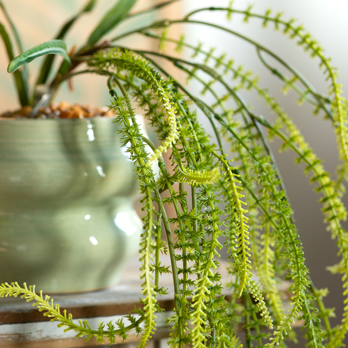 Oavsett om den är i vardagsrummet, på uteplatsen eller vid stora evenemang – dess mångsidighet kommer att glädja dig. De som älskar den trendiga urbana djungelstilen kan vackert kombinera denna konstgjorda klätterväxt med trä- eller rottingmöbler. Den blir också ett elegant dekorativt element på kaféer, i butiker eller hotell, och lägger till subtila accenter och ger varje rum den där speciella touchen. Tack vare sin enkla grönaktiga färg kan rävsvansörten kombineras med både ljusa och mörka toner.