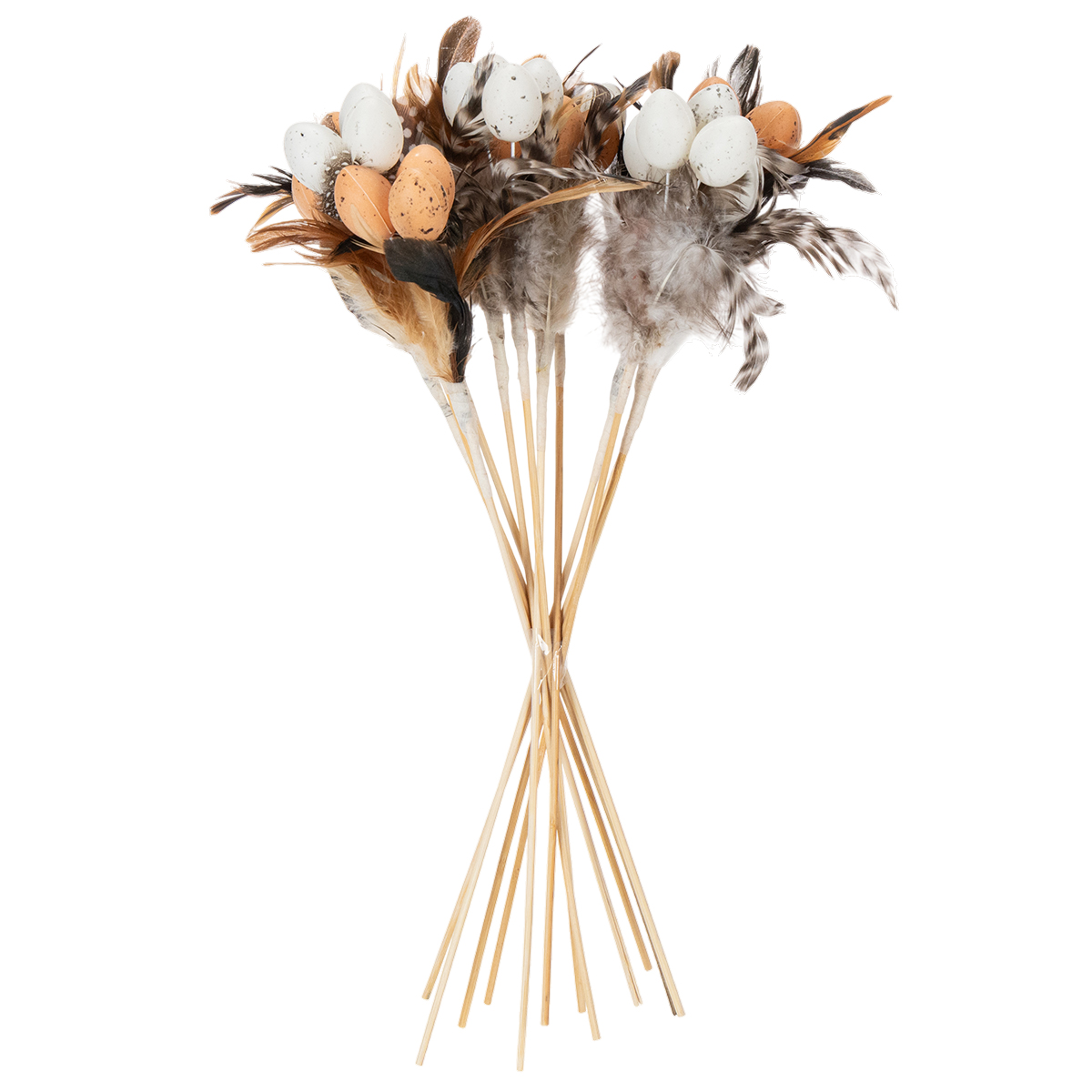 Konstgjorda vaktelägg, dekorativa fjädrar på pinne, 36 cm, 12 stycken