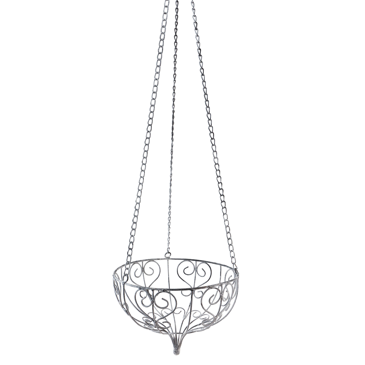 Metallkorgen har formen av en skål som går ihop i botten för att bilda en rund spets som en antik dekoration. Metallkorgen är stabiliserad på tre kedjor. Upptill knyter en krok ihop kedjorna som du sedan kan använda för att hänga metallkorgen i taket.