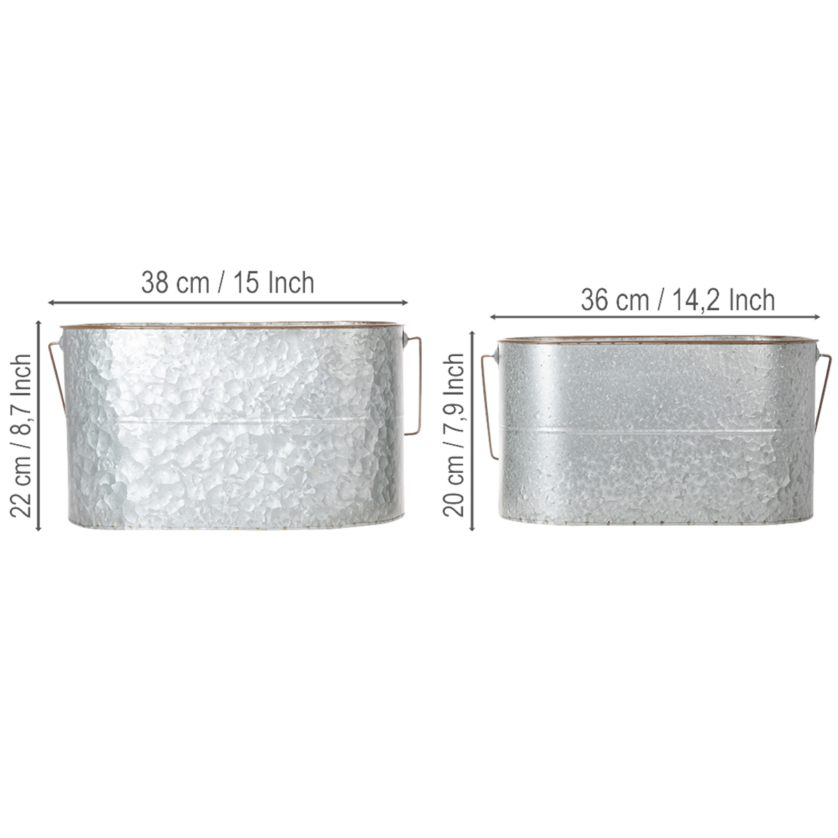 Kruka med handtag, metallkruka, planteringslåda, silver, brun, H22/20cm L42/40cm, set om 2
