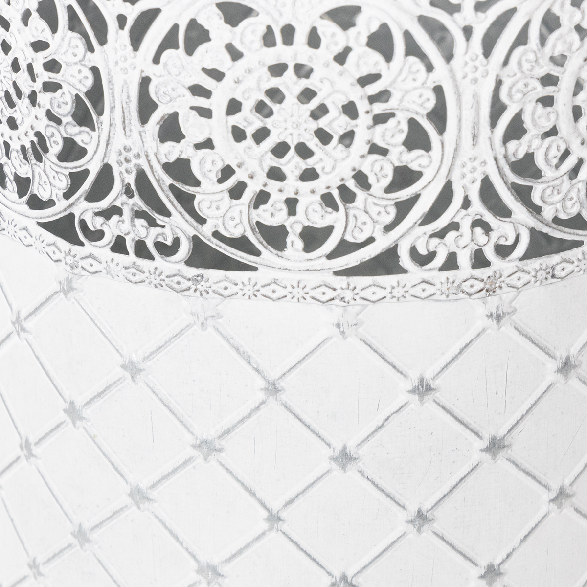 Denna växtkruka med spetsmönster i vitt kommer som ett set med 3 högkvalitativa metallkärl i trendig shabby chic! Den vita färgen på den dekorativa hinken låter metallkärlets silver lysa igenom på präglingen och kanterna.