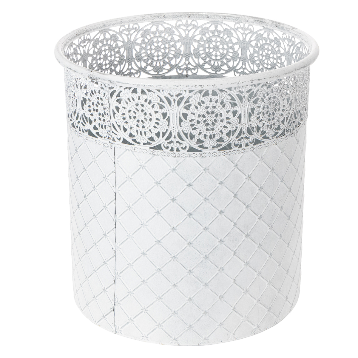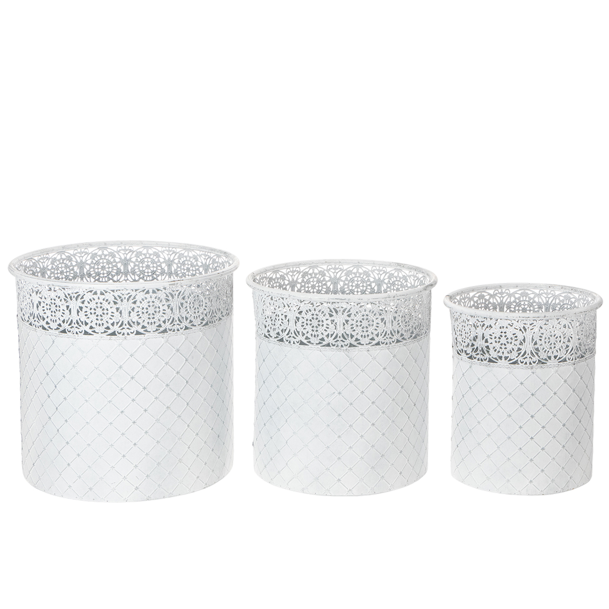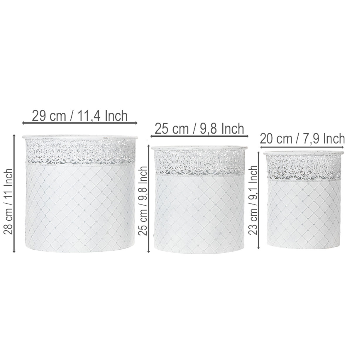 Kruka med spetsmönster, metallbehållare, dekorativ hink, vit, silver, shabby chic, H28/25,5/23,5 cm, Ø29,5/25,5/20 cm, set om 3