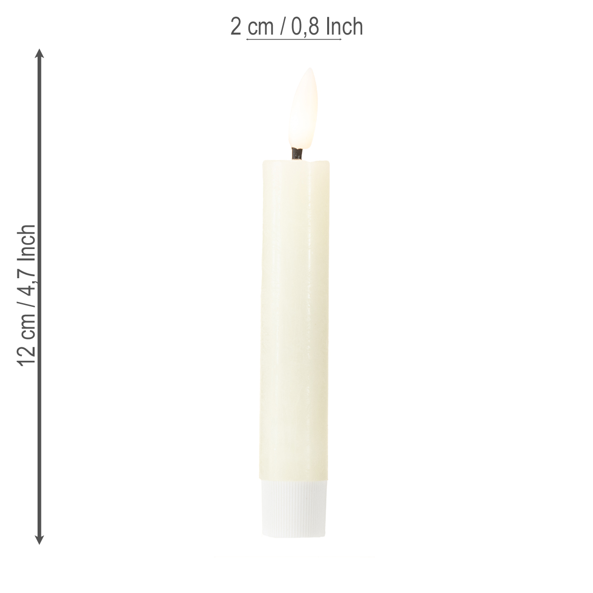 Ljusen är 14,5 cm höga och perfekta för eleganta ljusstakar i standardstorlek, såväl som för adventskransar. De gör inte bara sin magi i festliga juldekorationer. Batteridrivna och sladdlösa, de kan användas överallt – inget eluttag behövs! Oavsett om de är på fönsterbrädan, vid dukningen eller som en del av ett romantiskt gör-det-själv-projekt: dessa spetsiga ljus är mångsidiga och ger alla rum en elegant atmosfär.