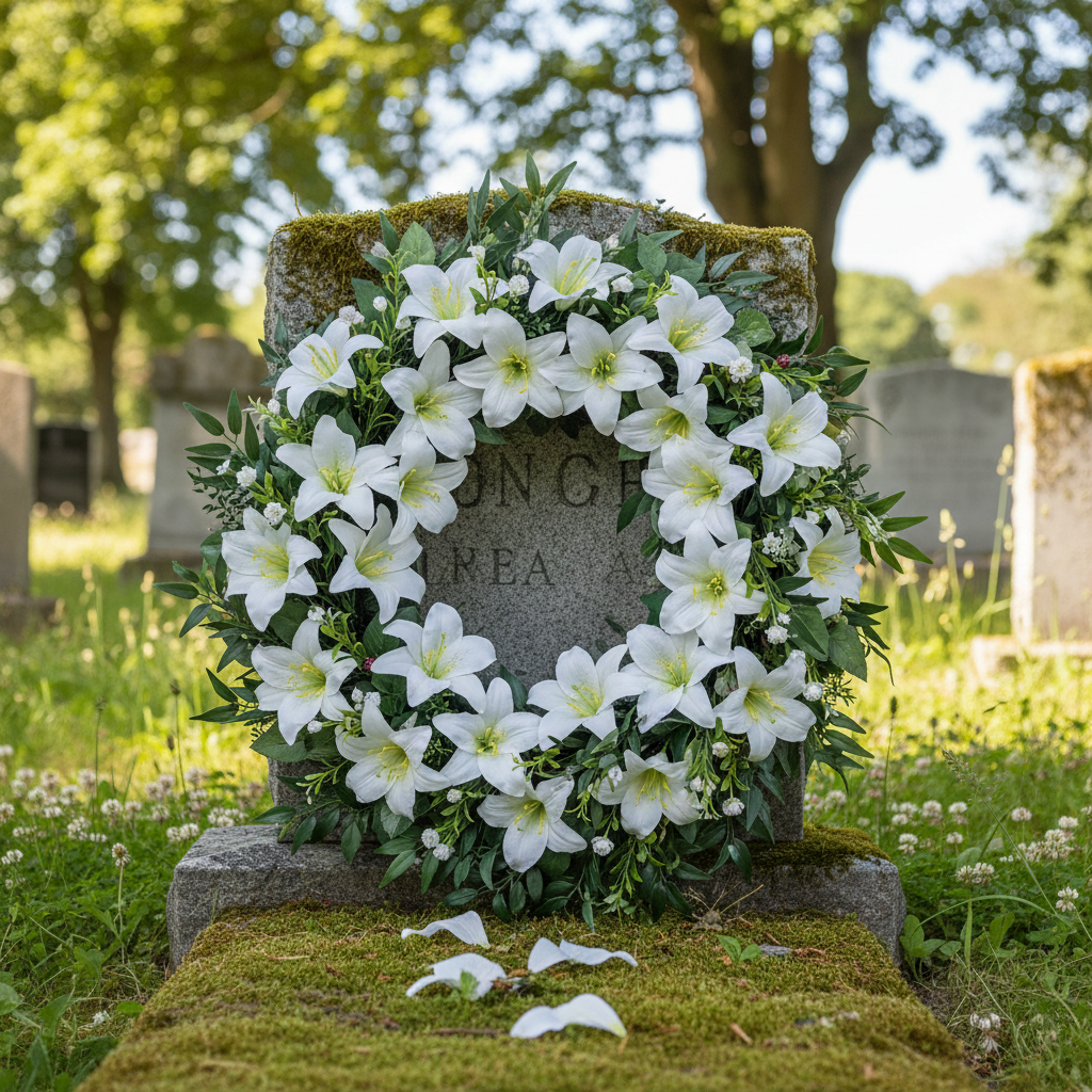 Som en konstgjord blomma är denna medelstora lilja på en tråd alltid en populär komponent för ett begravningsarrangemang, särskilt på en död söndag. Den vita liljan används ofta i begravningsblommor eftersom blomman symboliserar oskyldighet och hjärtat renhet. I form av en konstgjord växt har liljan fördelen att dess ädla blomblomma inte förstörs med de gula pollenstammarna och därmed upprätthåller sin utstrålning under mycket lång tid.