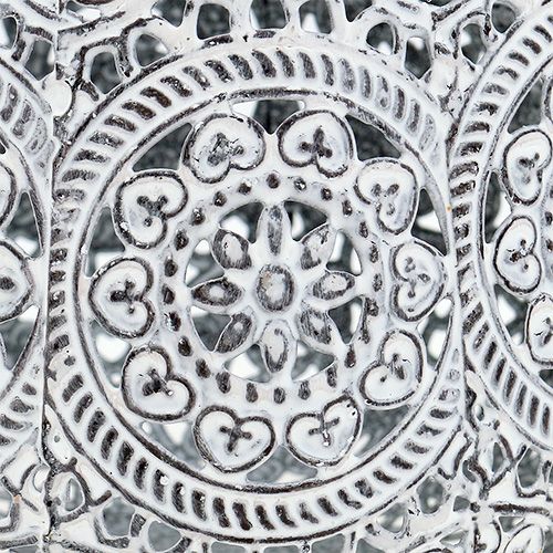 Lyktan i vitt med ornament har en plan bas, med vilken du kan placera hela saken säkert och stabilt på vilken plan yta som helst. Lykta har en höjd av cirka 13 centimeter och en diameter på cirka 12 centimeter. Öppningen är cirka 8 centimeter i diameter.