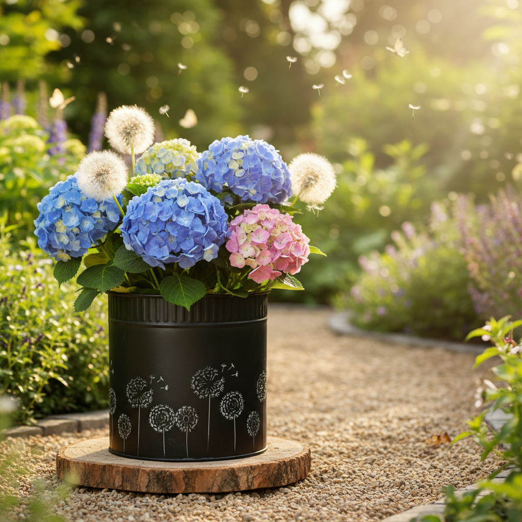 Planteringslådan med maskrosor ger blommor och arrangemang ett originellt utseende i sommardekorationer. Men den svarta blomkrukan kan också ge en speciell inramning för en liten grön växt.