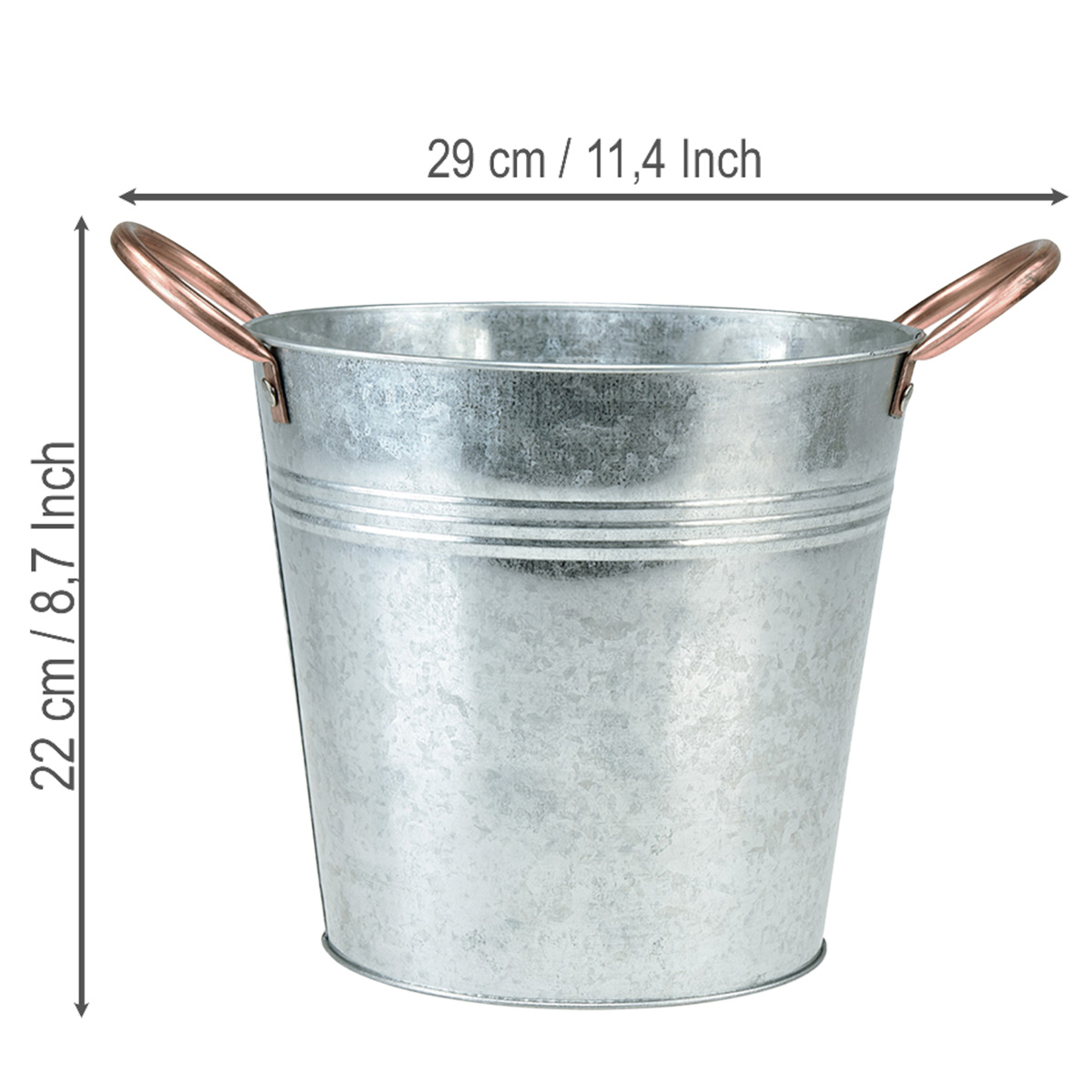 En fängslande kontrast mellan olika metaller skapas av de kopparfärgade handtagen på denna metallhink. Den galvaniserade, blanka silverytan ger planteringsmaskinen en subtil vintage-look. Före plantering är det lämpligt att fodra metallbehållaren med folie för att förhindra rost och korrosion.