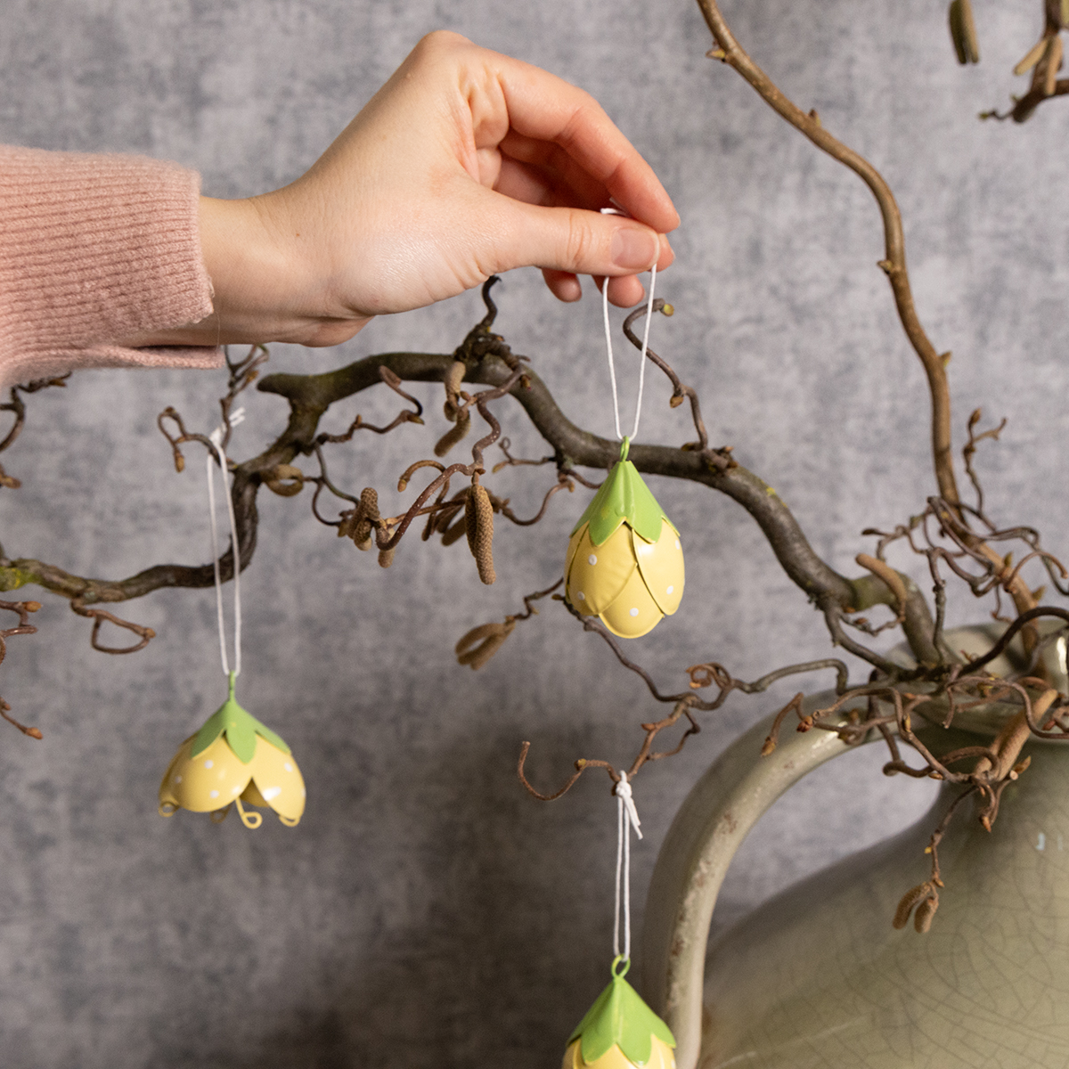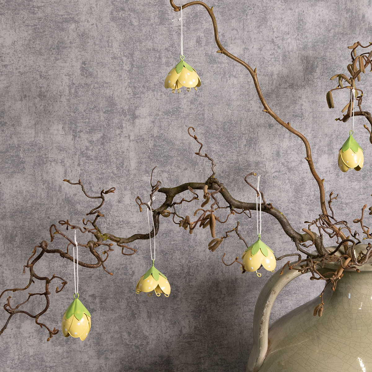 Dessa hängande metallblommor är perfekta för alla som älskar lekfulla och romantiska dekorationer. Med en höjd på 6 cm och en diameter på 4 cm är de inte för stora, men ändå ett elegant blickfång. De delikata gula och gröna färgerna skapar ett fräscht utseende och integreras vackert i en mängd olika stilar – från lantlig stil och shabby chic till klassiska blomsterarrangemang. Tack vare sin högkvalitativa metallkonstruktion är blommorna robusta och lämpliga för både inomhus- och utomhusbruk. De ser särskilt charmiga ut i en entré, där de välkomnar gäster med en glad touch.