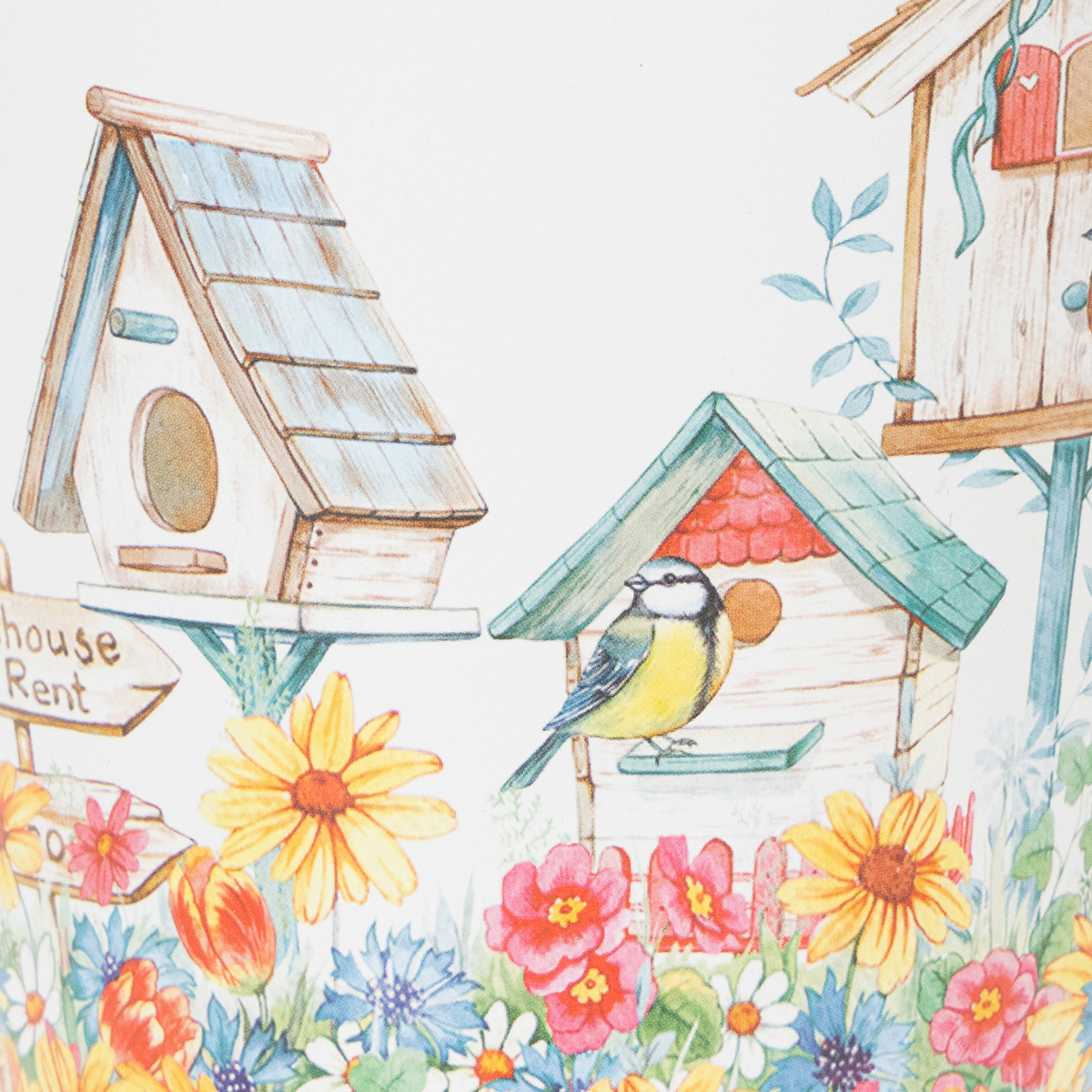 Denna plåthink är täckt med en tryckt film som visar ett färgglatt hav av blommor med tre olika holkar - några fåglar kan också ses.