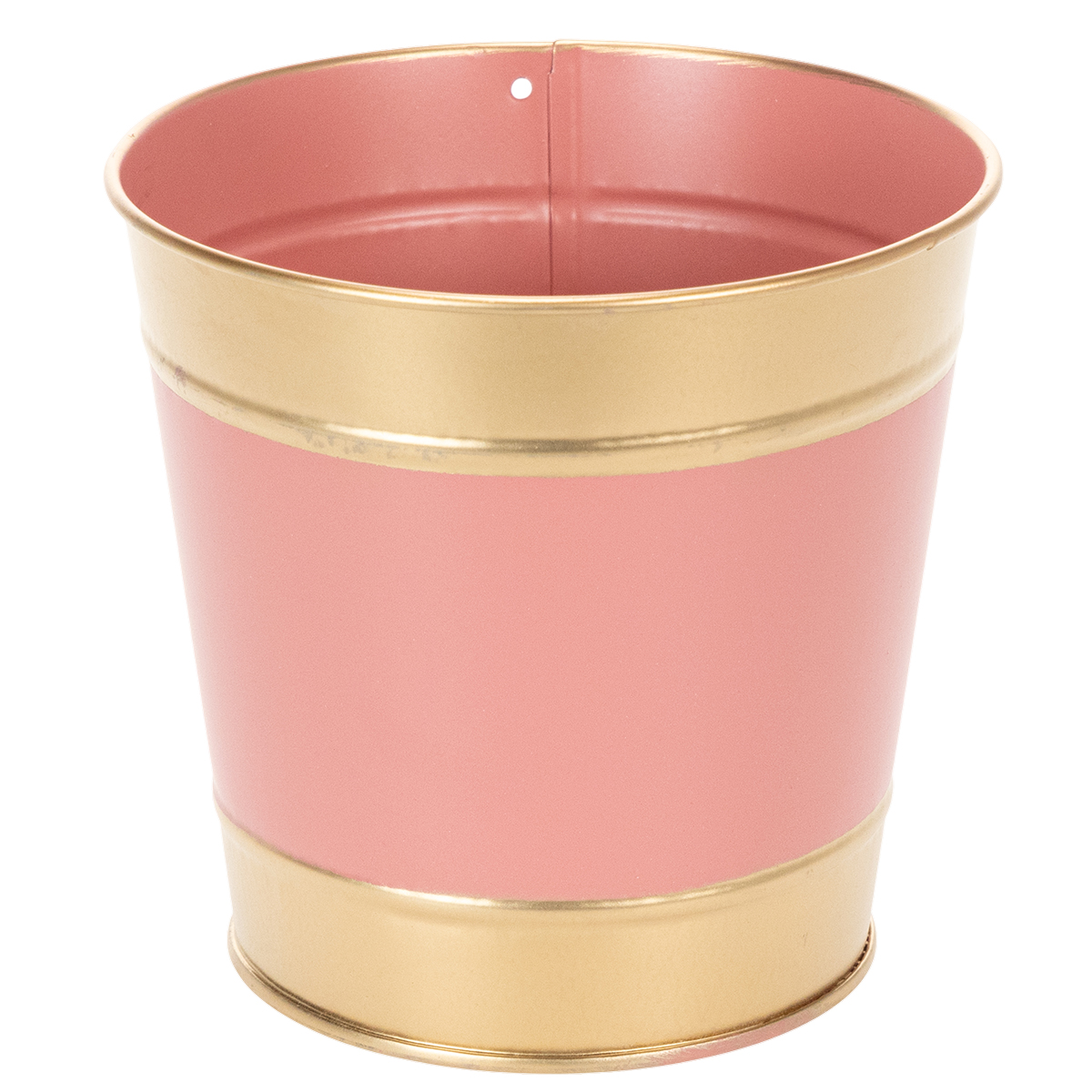 Planteringslådan har formen av en typisk plåthink med en extra gyllene kant upptill och nedtill. I mitten finns en rand i en av de fyra färgerna brun, beige, rosa och persika. Setet om fyra är färgkoordinerat och kan sättas upp så underbart tillsammans, till exempel på en blomsterpiedestal.